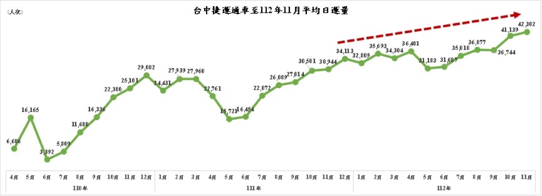 台中捷運頻傳捷報,11月日均運量達42302人次,再創新高!中捷表示,今年疫情趨緩運量持續成長,中捷持續強化系統各項安全作為;另因應年末假日各項活動增加,明日起將加密假日班距,提升載客量。