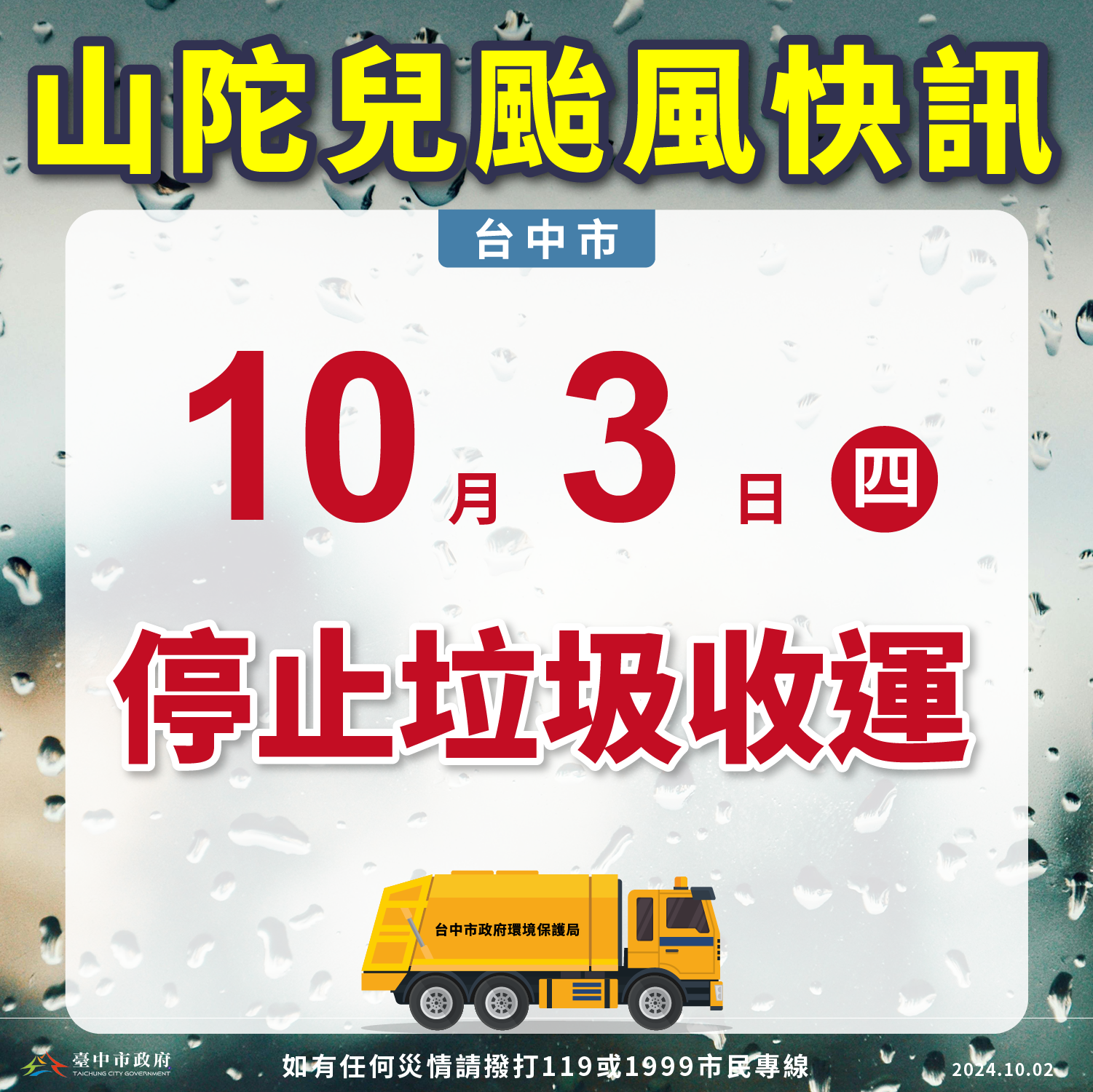 山陀兒颱風來襲,依據交通部中央氣象署資訊,台中市政府宣布今日停止上班上課,垃圾收運也將暫停一天,提醒民眾暫時將垃圾留置家中,勿任意棄置。環保局表示,為避免民眾外出發生危險,且環保局配合防災中心成立,清潔人力優先投入重要道路路樹路障之排除、水溝通暢清疏工作等災情即時處理工作,今日暫停垃圾收運、資源回收及廚餘收運,提醒民眾注意自身安全,暫時將垃圾留置家中,勿任意棄置垃圾包,以免影響環境衛生及堵塞水溝造成災情。