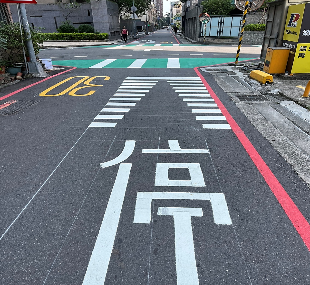 本次設計在巷口兩側道路施作黑白交錯的楔型標線,形成「視覺變窄」效果,被稱為「白色鋼琴鍵」,讓駕駛在接近路口時降低車速,同時,於行人穿越處畫設綠底斑馬線,增加辨識度,使行人動線更加清晰。交通局也在周邊增設「速限30」、「當心行人」、「停車再開」等標誌及行車引導線,建構多層次安全防護措施,達到人車分流的目的。