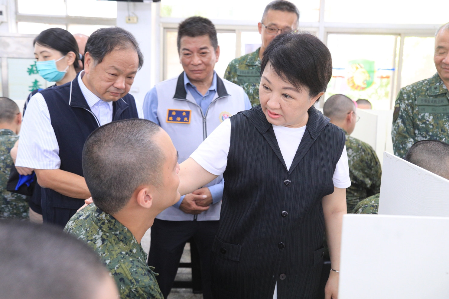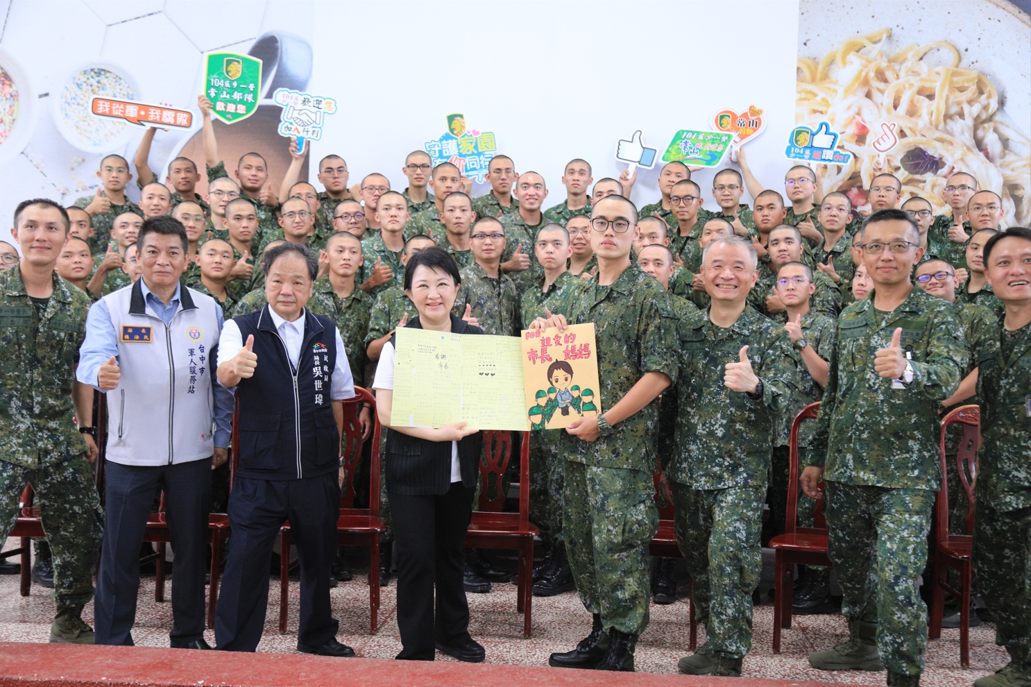 關心役男在軍營的適應情況,市長盧秀燕在民政局長吳世瑋陪同下,帶著漢堡和可樂前往成功嶺營區陸軍步兵104旅探視,慰勞陸訓第0183梯次市籍役男,並與大家合影留念,受到役男歡迎,當天役男也回贈精心手繪的「Q版市長」感謝卡,卡片裡寫滿役男對盧秀燕的感謝話語,她期許役男成功完成各種訓練與測驗,順利退伍,從男孩蛻變成男人!