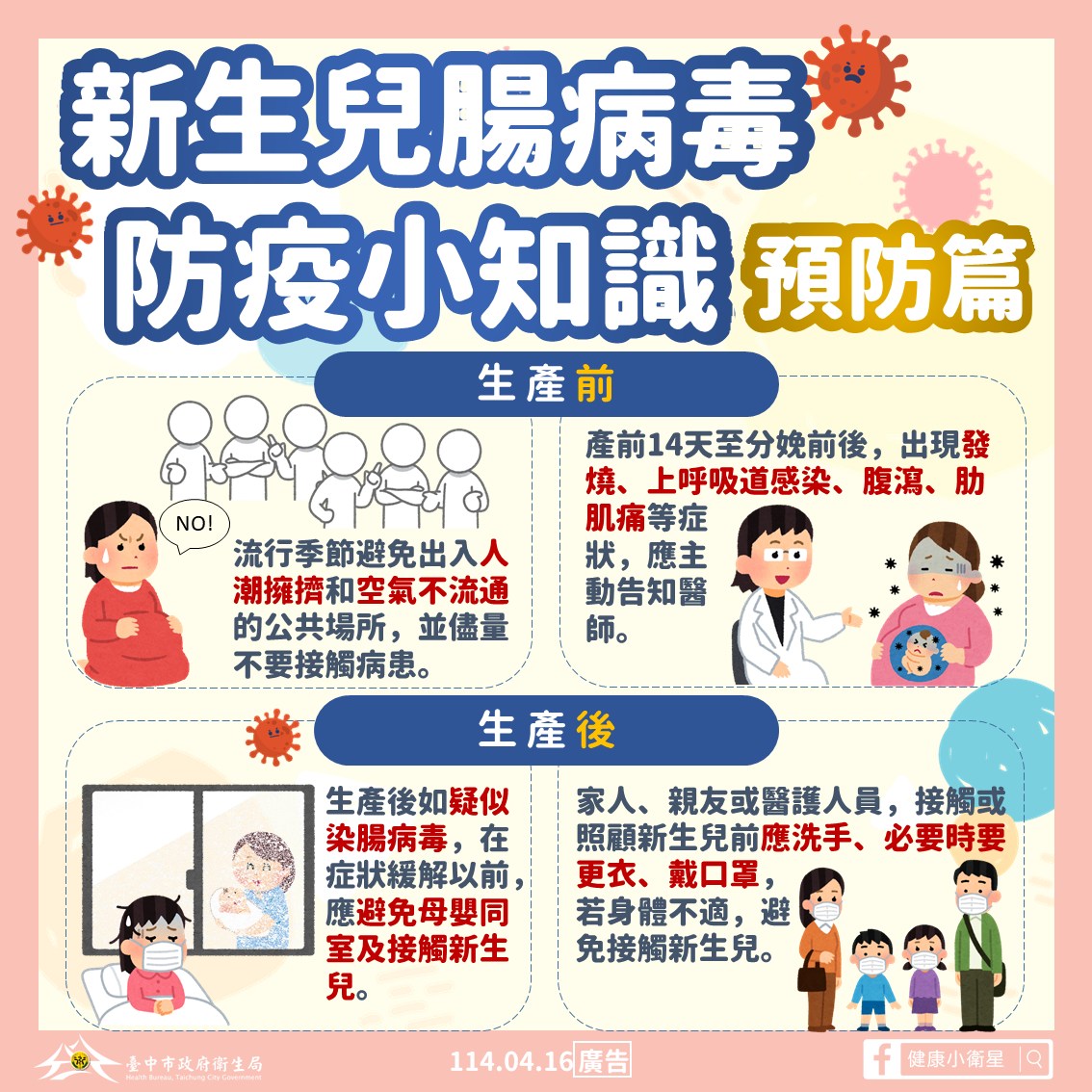 衛生局長曾梓展表示,腸病毒在新生兒間的傳播,主要透過「母嬰垂直感染」與「接觸感染」兩種途徑。若孕婦生產前感染腸病毒,病毒可能經由胎盤或產道傳染給新生兒;而照顧者若未留意衛生,也可能在日常接觸中將病毒傳播給寶寶,是造成新生兒感染的重要風險之一。孕婦若在預產期前14天至分娩前後出現發燒、上呼吸道感染、腹瀉等疑似腸病毒症狀,應儘速就醫,並主動告知醫師。