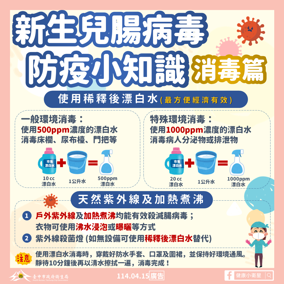 此外,良好的環境衛生同樣是防範腸病毒的關鍵。新生兒經常接觸的物品,如尿布台、床欄等,應使用含氯漂白水定期清潔消毒。日常消毒可使用500ppm濃度,若遇排泄物或嘔吐物污染,則建議以1000ppm進行加強清潔。天然紫外線與加熱煮沸也具殺菌效果,可將清洗後的物品放置於戶外,利用日曬進行簡易消毒。