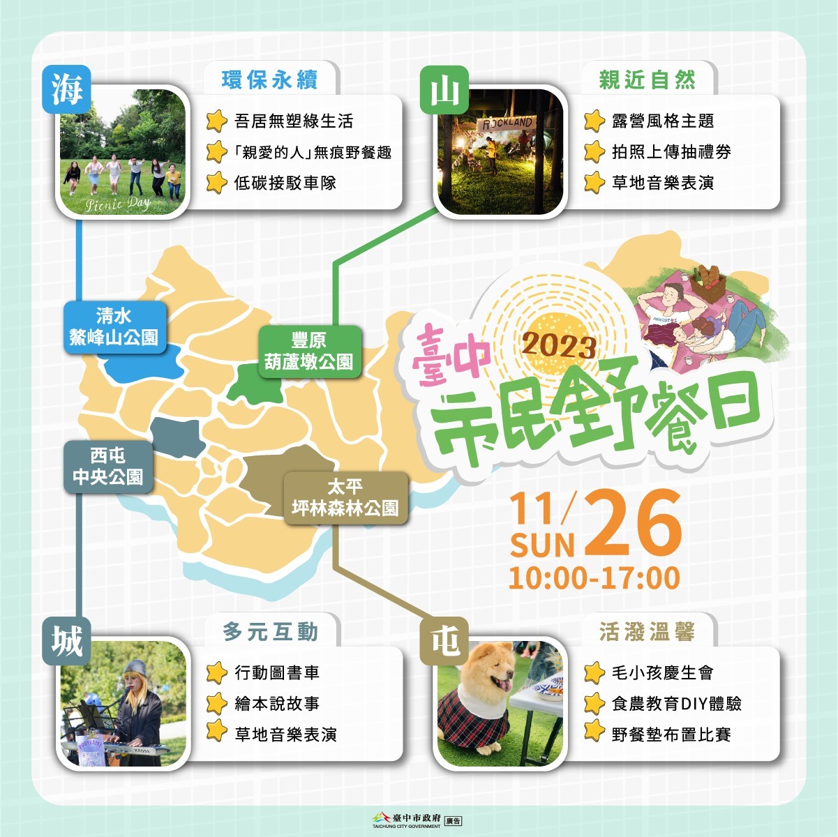 「2023台中市民野餐日」11月26日登場,將於中央公園、豐原區葫蘆墩公園、清水區鰲峰山公園、太平區坪林森林公園4地以「親愛的人」為主題,號召民眾共襄盛舉。市長盧秀燕今日主持市政會議指出,此屆擴大舉辦,並依照「山、海、屯、城」各區特色規劃不同主題,歡迎民眾帶著最愛的人共享野餐時光!