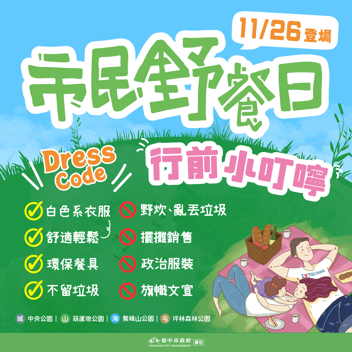 她強調,為讓民眾享受一個沒有干擾、輕鬆舒服的野餐日,活動禁止任何選舉活動及流動攤販擺攤,且勿在現場烹調,共同維護公園綠地,也鼓勵大家搭乘大眾交通運輸工具前來參與。