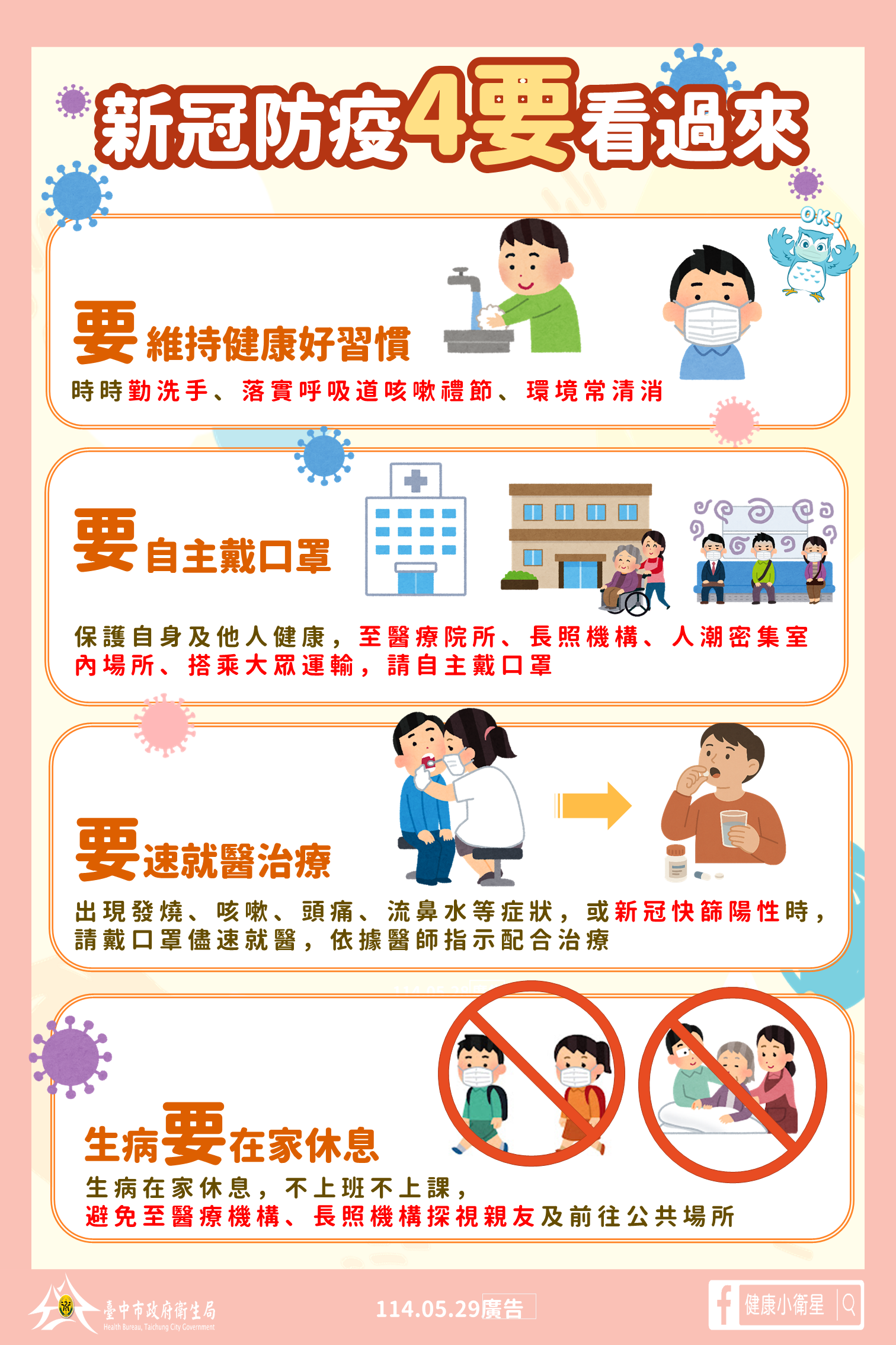 衛生局呼籲,民眾端午假期聚會與出遊頻率增加,進入醫院、診所、長照機構、搭乘大眾運輸工具或前往人潮聚集的室內場所時,請自主佩戴口罩;如有呼吸道症狀,建議避免探病及參與群聚活動;並落實手部衛生與咳嗽禮節,如使用面紙或衣袖遮掩口鼻等好習慣。