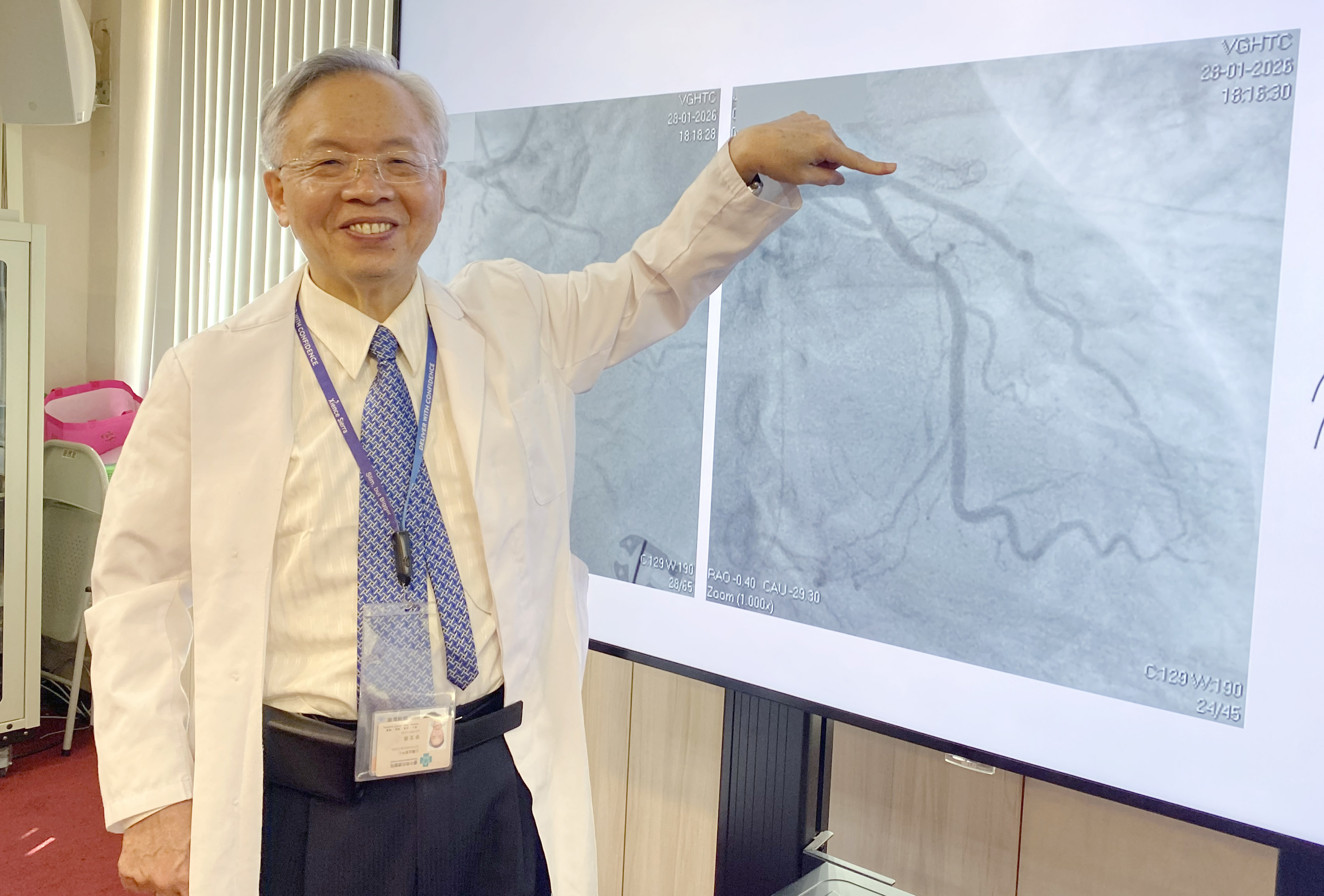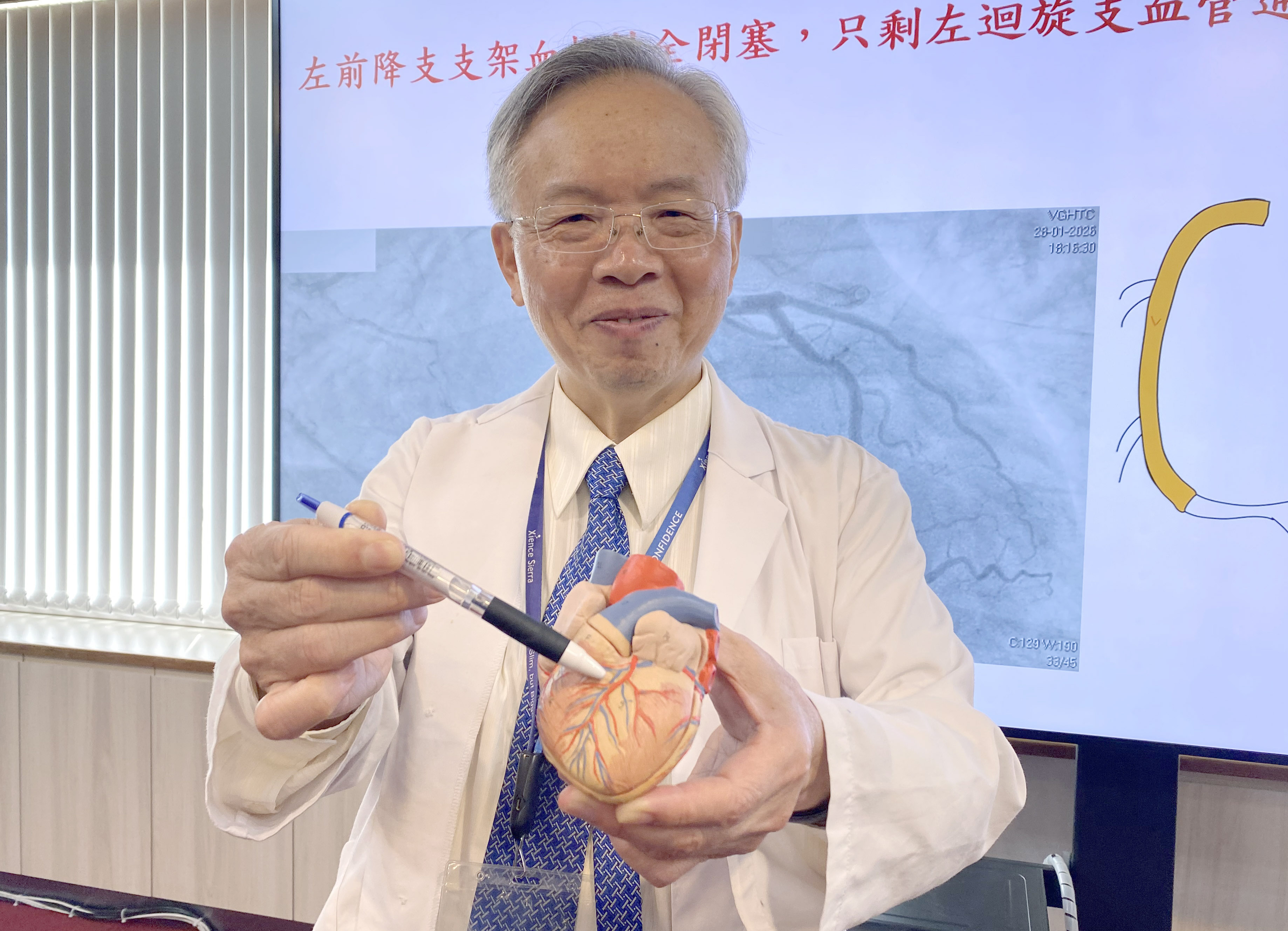臺中榮總心血管中心主任李文領表示,75歲洪姓男子因慢性冠心症接受心導管介入治療時,突發罕見的右冠狀動脈急性閉塞,引發心因性休克、心跳過慢及呼吸衰竭,須插管維持呼吸,患者在彰化醫院穩定生命徵象後轉送臺中榮總。醫療團隊採用逆向導絲搭配正向鑽入型微導管技術,成功打通嚴重鈣化且長段閉塞的右冠狀動脈並放置支架,該技術多用於慢性全阻塞血管(CTO)治療,需高度精準的導絲操控,患者術後第3天恢復正常心律並脫離呼吸器,第5天順利出院。