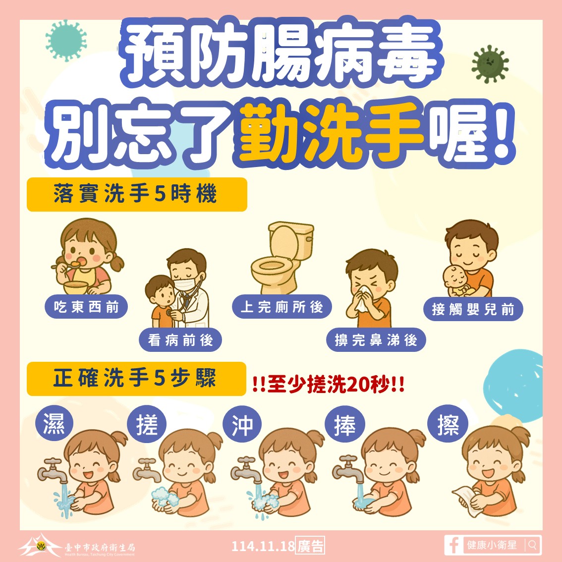 衛生局長曾梓展表示,雖已接近冬季,但氣溫偏高,社區仍有腸病毒傳播風險。腸病毒傳染力強,成人與兒童皆可能受感染,為減少幼童互動造成的傳播,曾梓展呼籲民眾確實執行「溼、搓、沖、捧、擦」五步驟洗手法,以及掌握接觸公共區域後等五大時機勤洗手。家長返家後應先清潔身體與更換衣物再接觸幼童;托育與教保機構也應以500 ppm含氯漂白水定期消毒幼童經常接觸的物品表面,以降低交叉感染。
