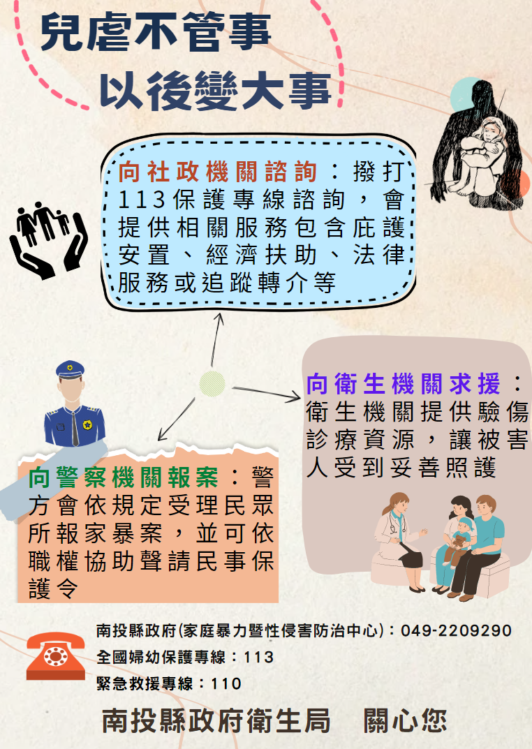 兒虐零容忍,杜絕任何形式的暴力,若發現孩童有遭受到受虐的跡象,必須立即通報,並依指示到指定的驗傷採證醫院進行診療驗傷及蒐集證據,醫院會協助被害人完成驗傷、筆錄詢問服務。