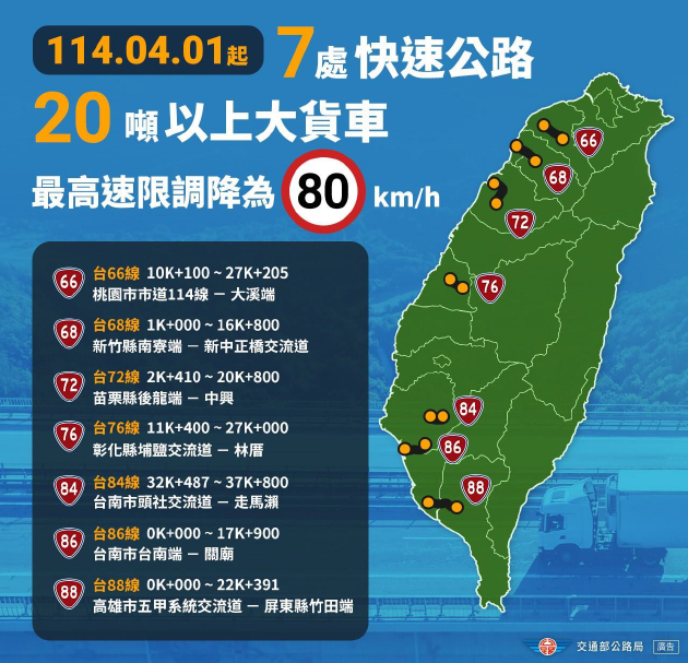 為維護快速公路交通安全,交通部公路局去年開始,調整多條快速道路大貨車速限,最高速限從現行的90公里/小時降至80公里/小時,這項新制將擴大至7條快速道路,包括台72線2K+410至20K+800(後龍端至中興端)路段,並從今年4月1日正式上路,屆時若超速違規最高可罰3萬6,000元。
