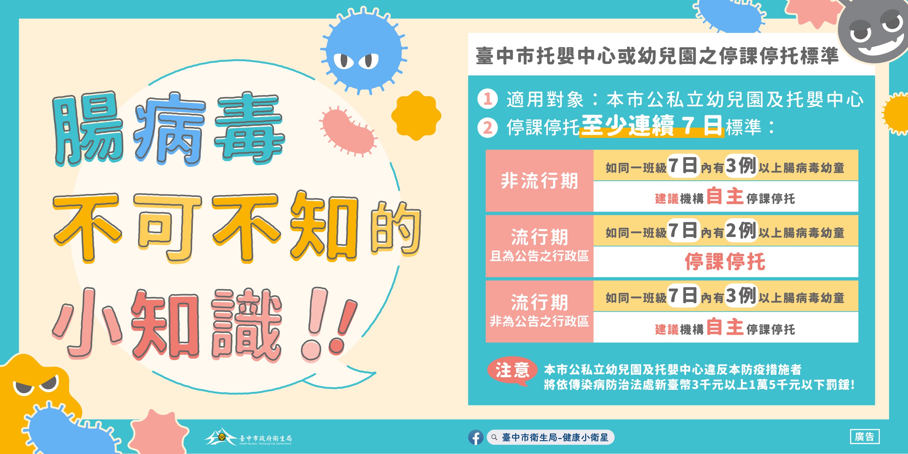 衛生局長曾梓展說明,截至5月12日,國內腸病毒感染併發重症病例累計3例,有關國內腸病毒門急診就診人次,疾病管制署公告已達流行閾值(11,000人次),為維護幼兒健康,依據台中市腸病毒通報及停課、停托標準,感染腸病毒學童應請假在家不上課、不收托至少7天,如托嬰中心或幼兒園等學前教托育機構所在的行政區於今年有曾被檢驗出腸病毒71型陽性個案或腸病毒感染併發重症確定個案時,同一班級7日內有2名兒童感染腸病毒必須停課7日;若非為公告的行政區,則同一班級7日內有3名兒童感染腸病毒時,建議自主停課7日。