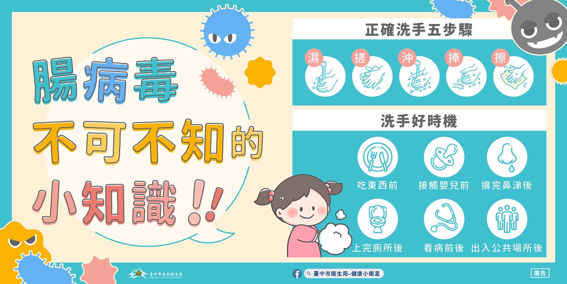 依據疾病管制署疫情監測資料統計,台中市今年4月16日至5月6日腸病毒門、急診就診分別為1,390、1,839及1,865人次,台中市雖尚無腸病毒重症確定病例,但社區腸病毒感染風險持續升溫,衛生局提醒,落實3撇步,包含勤洗手、重點性消毒及生病不上課,有效避免腸病毒。
