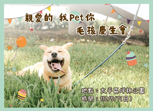 2023台中市民野餐日將於5月7日在台中山、海、屯、城四地同步登場,台中市動物保護防疫處結合活動內容,將於太平區坪林森林公園舉辦「親愛的我Pet你」毛孩慶生會,即日起開放線上報名,限額100名,額滿或至4月30日為止。