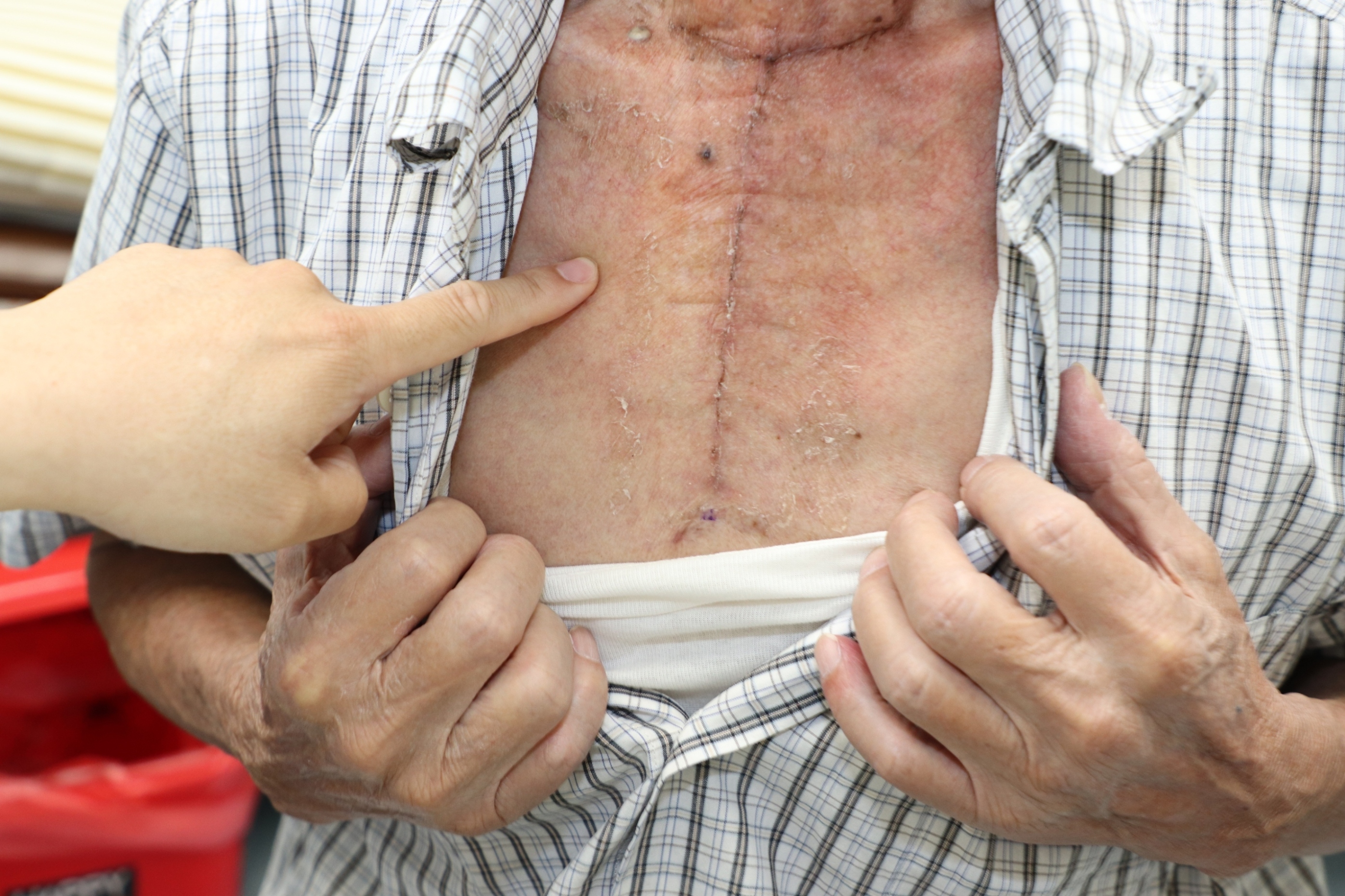 70多歲郭老先生近期常因日常活動,造成胸悶喘與呼吸困難,於是到仁愛長庚合作聯盟醫院胸腔內科求診,經檢查發現胸腔有一顆約13公分且鈣化的巨大甲狀腺腫瘤,遂轉診至一般外科巫奕儒主任門診。經評估此甲狀腺結節已壓迫氣管和肺臟造成胸悶情況,因此聯合胸腔外科廖啟耀醫師在其頸部與胸骨上段進行微創開胸手術,成功移除腫瘤,住院一週後即順利出院。