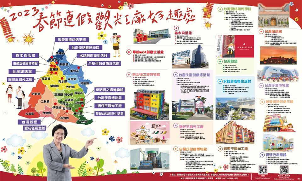 今年農曆春節連假長達十天,彰化縣長王惠美表示,兔年過年期間到彰化觀光工廠、商圈走春絕對是最佳首選!她說,彰化縣府由經濟暨綠能發展處特別彙整春節期間,縣內15家觀光工廠與彰化永樂、鹿港老街、田尾等商圈優惠或新春導覽活動,非常適合親子出遊、逛街購物,歡迎全台民眾一起到彰化旅遊。