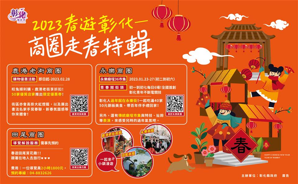 彰縣經綠處指出,最有年味的鹿港老街商圈推出「旺兔順利購,鹿港老街享折扣」,即日起至2月28日,只要到指定的50間店家,皆能享不同的優惠折扣;濃厚廟埕文化的永樂商圈也在年初二至初六推出「永樂廟埕36市集」及「青春鬧街頭」活動,到永樂街即可吃遍40家的銅板美食、採買百年伴手禮,還有特技、扯鈴等競技活動,感受滿滿年味;賞花踏春,除溪州的「花在彰化」,田尾商圈也特別推出導覽解說服務,只要電話預約,就有專業解說員導覽花園祕境。
