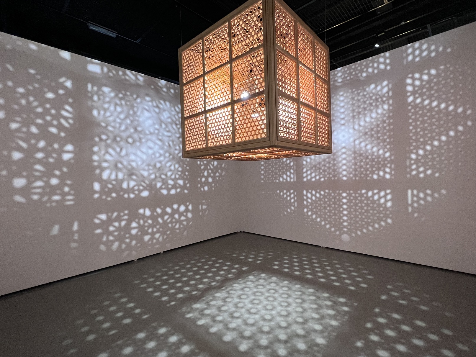 纖博館進一步說,展出作品中由法國設計師Samuel Misslen設計、林美如創作的〈光〉,是纖博館開館大展最受歡迎的作品,這次展覽中再度現身,集合各種竹編技法的立方體竹編燈,內置燈源投影於牆上,呈現千變萬化的幾何圖形光影,成為眾人注目的焦點。黃文英的〈反光途徑〉和〈過去的時光〉兩件提花梭織作品,則從「指引」和「探索」呼應此次策展的主題,鼓勵觀賞者運用手電筒的探照與反射,尋找圖案中的故事。