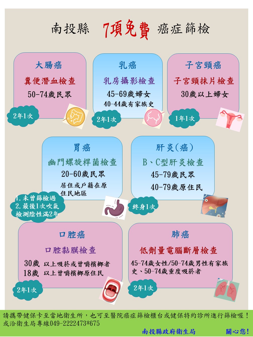 投縣衛生局長陳南松表示,受新冠疫情影響,多數民眾擔心到醫療院所增加染疫風險,而降低就醫意願,導致癌症篩檢量下降。南投縣疫情爆發後近2年的篩檢量減少51%,約6萬2950人。根據國健署資料顯示,子宮頸抹片檢查可降低約70%子宮頸癌死亡率;每2年1次糞便潛血檢查可降低23%大腸癌死亡率;每2年1次乳房X光攝影檢查可降低41%乳癌死亡率;定期接受口腔黏膜檢查,可降低有嚼檳榔或吸菸習慣之男性26%死亡風險。呼籲符合癌症篩檢資格的民眾,可定期到醫療院所接受篩檢,建立定期篩檢的習慣。