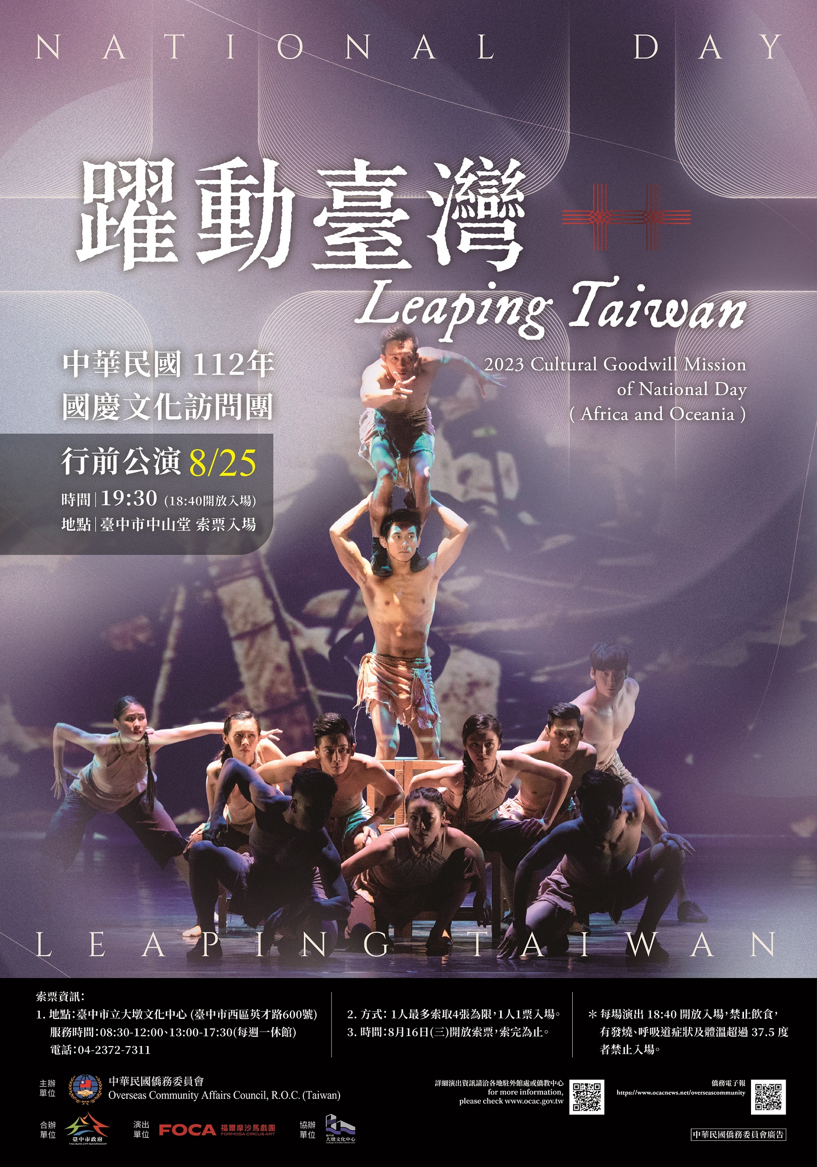 由僑務委員會主辦、台中市政府合作舉辦的「112年國慶文化訪問團」澳紐非團行前公演暨授旗儀式,將於8月25日19時30分於台中市中山堂由FOCA福爾摩沙馬戲團帶來《躍動台灣》精彩演出,8月16日起可至大墩文化中心免費索票,數量有限、索完為止。