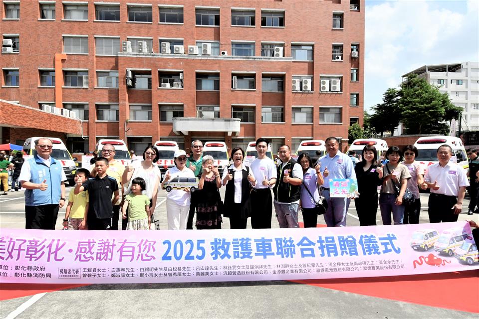 彰化縣政府今(9)日於縣警局中庭舉辦「2025救護車聯合捐贈儀式」,縣長王惠美代表接受21位捐贈者共同捐贈的13輛救護車,總金額達4,814萬元。統計近兩年,彰化縣共獲得32輛救護車捐贈,總值突破1億1,500萬元,為全國規模最大紀錄。