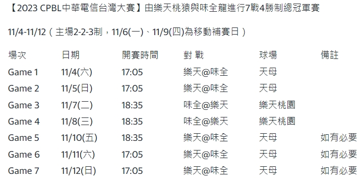 「2023 CPBL中華電信台灣大賽」將於11月4日至12日進行7戰4勝的賽事,將由樂天桃猿交手味全龍,季後挑戰賽取得3連勝的樂天桃猿來勢洶洶,展現強烈爭冠企圖心,力拚隊史第8座總冠軍。