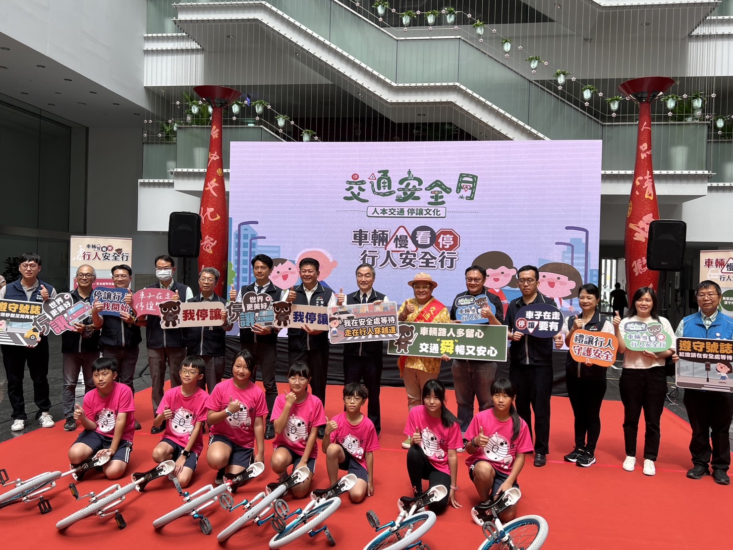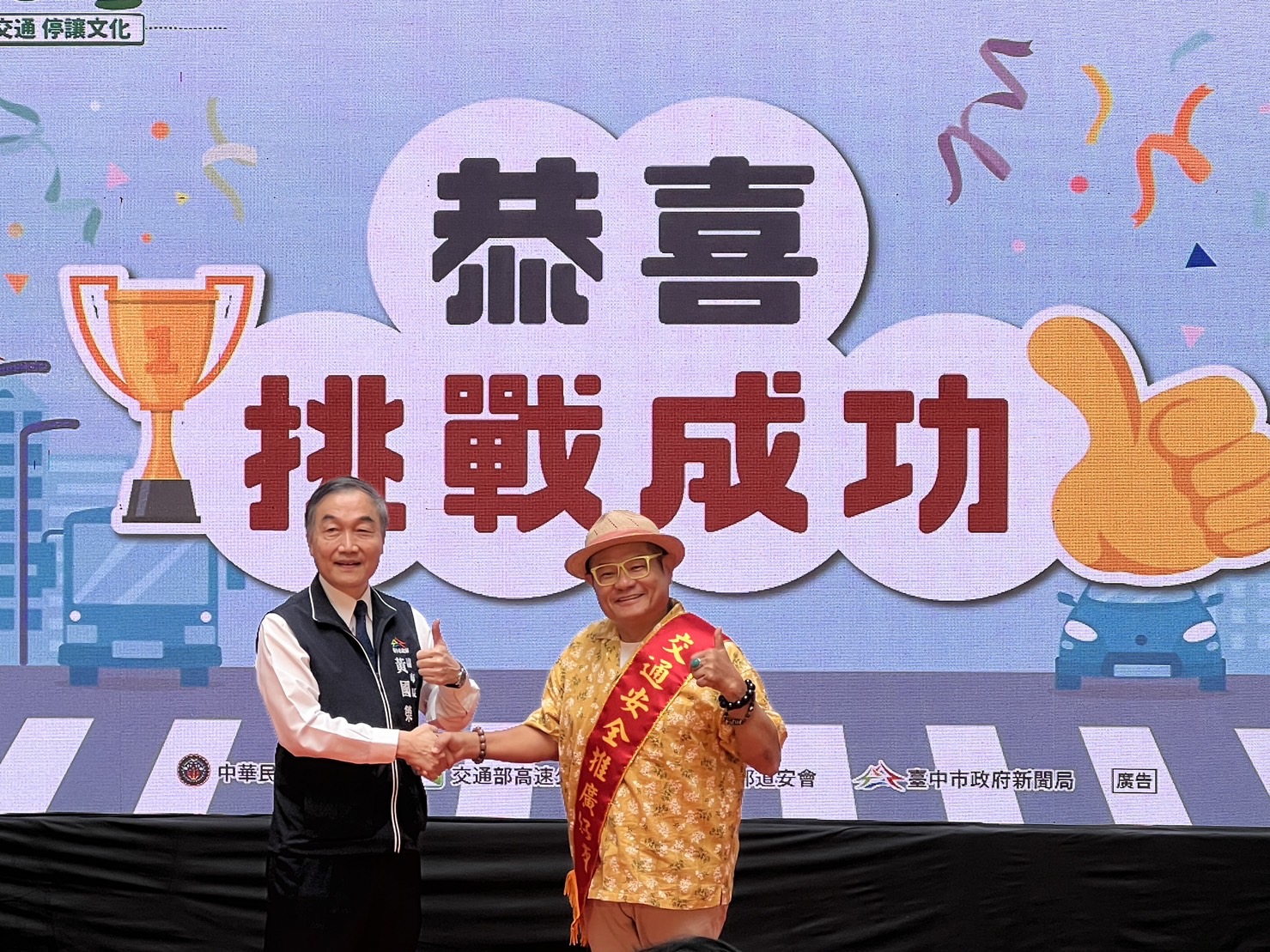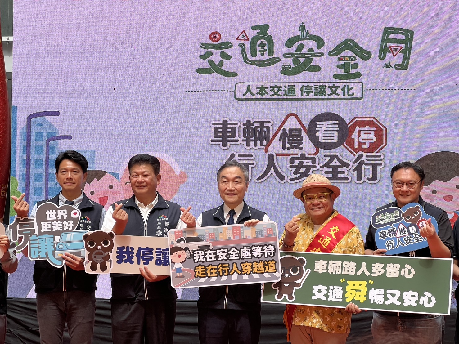 為強化民眾交通安全認知,「車輛行人多留心 台中好行好舜暢」台中市政府112年交通安全月聯合宣導記者會今日舉辦,今年以「車輛慢看行,行人安全行」為主題,特邀藝人許效舜擔任「交通安全推廣好友」。台中市副市長黃國榮出席活動時表示,9月為交通部訂定的交通安全月,但時時刻刻都需要注意交通安全,期盼透過記者會及許效舜的宣導,把遵守交通安全規則深植在每個用路人的內心,減少交通事故發生。