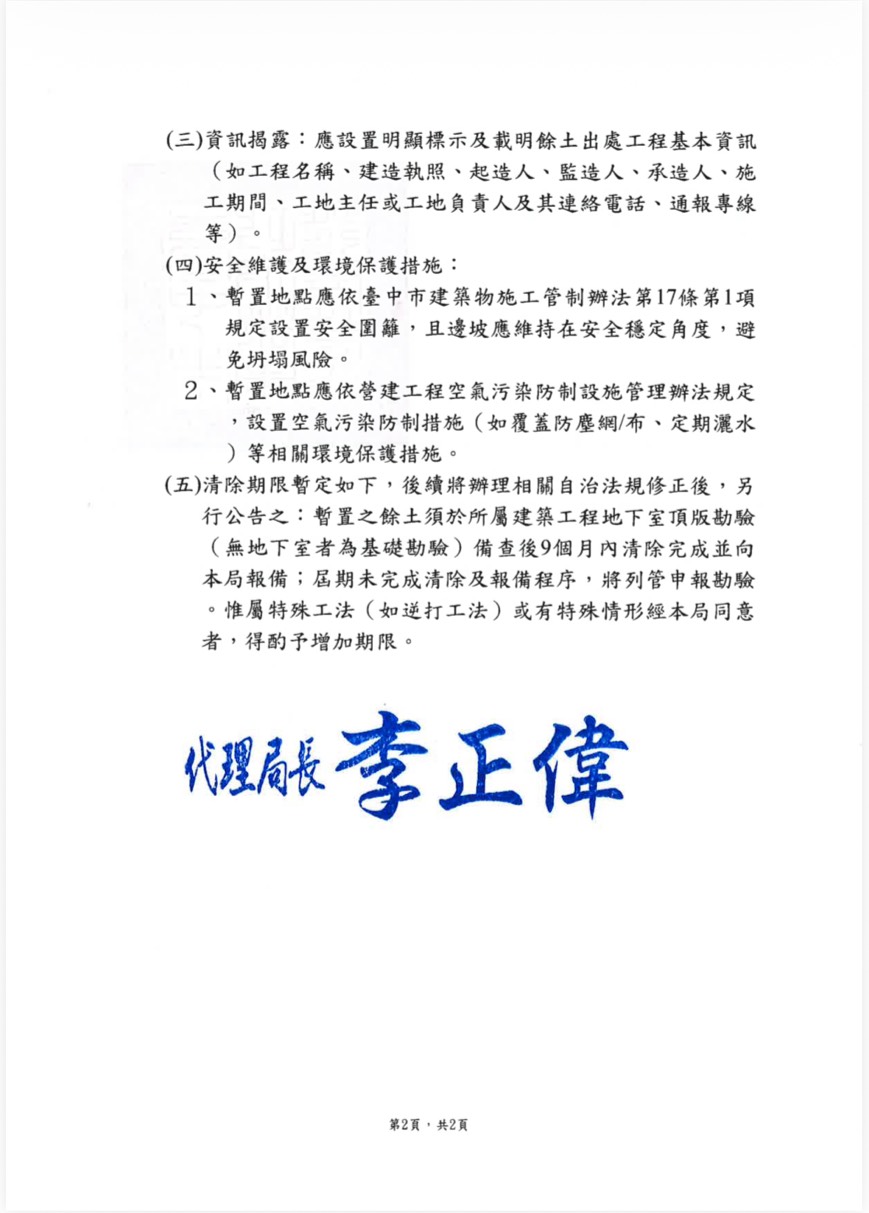 都發局長李正偉表示,此次公告的重點在於兼顧工程實務彈性與管理秩序,透過事前報備、施工管理及期限管制,建立可追溯、可控管的營建餘土暫置機制,持續強化台中市營建剩餘土石方管理,確保公共安全與環境品質。
