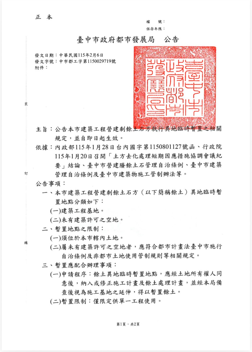 為因應建築工程施工期間營建剩餘土石方的暫置需求,並減輕土資場後端去化壓力,台中市政府公告「建築工程營建剩餘土石方異地臨時暫置」相關規定,即日起正式實施,期望透過制度化管理,強化餘土流向控管與施工安全。