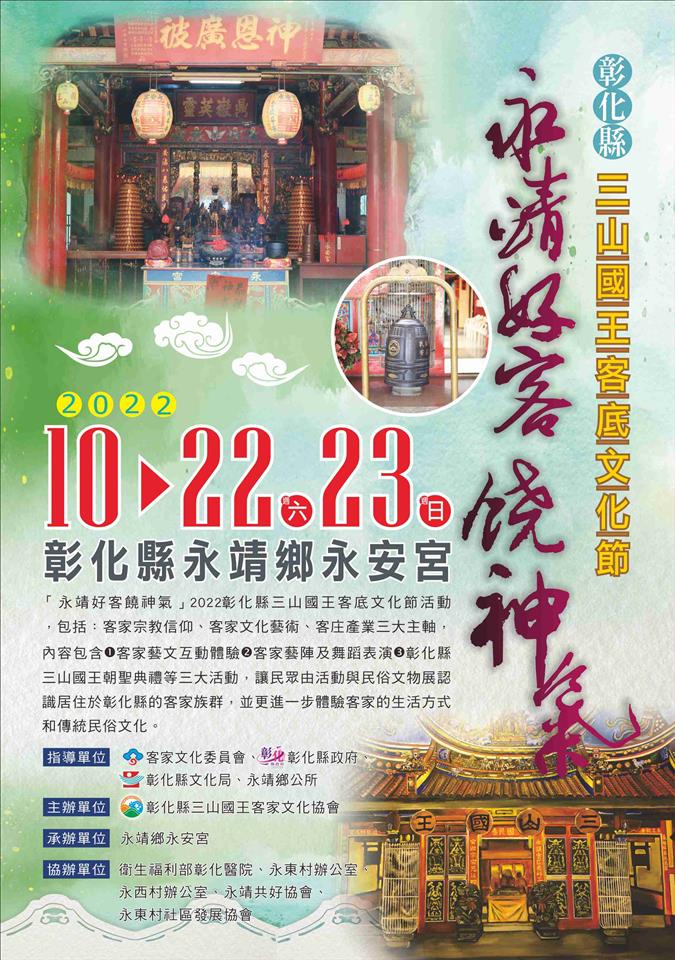 2022年「永靖好客饒神氣」彰化縣三山國王客底文化節系列活動,將於10月22、23日在永靖鄉永安宮舉辦。今日上午於永安宮舉辦記者會,縣長王惠美表示,三山國王客底文化節由彰化縣三山國王文化協會整合縣內39間三山國王廟,每年擲筊決定主辦活動的宮廟,今年主辦的永靖永安宮已有200年以上歷史深具意義,期望藉由此活動,讓客家文化發揚光大。