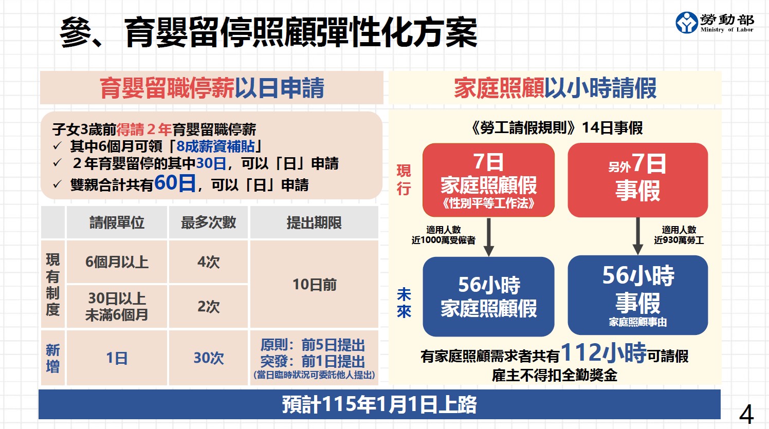 為協助勞工兼顧職場與家庭,勞動部將自明年1月1日起實施「育嬰留停照顧彈性化」方案,放寬請假制度。台中市政府勞工局表示,未來勞工如遇子女需短期照顧,可改以「日」為單位申請育嬰留職停薪;若臨時出現保母請假或突發狀況,則可「時」為單位申請家庭照顧假,請假方式更加彈性。