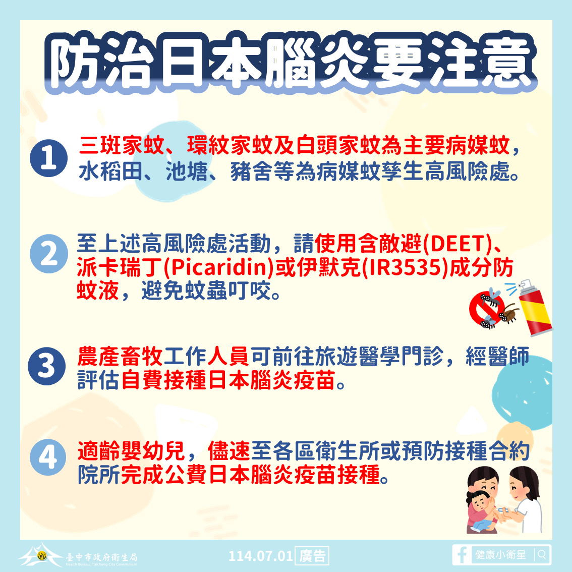 此外,接種疫苗是預防日本腦炎最有效的方法。截至6月底,台中市3歲以下幼兒第1劑疫苗接種率為94.81%,第2劑為87.33%。家長應留意接種時程,分別為滿15個月接種第1劑,間隔一年再施打第2劑。若家中有尚未完成接種的幼兒,請儘速前往台中市各衛生所或合約院所完成疫苗接種。