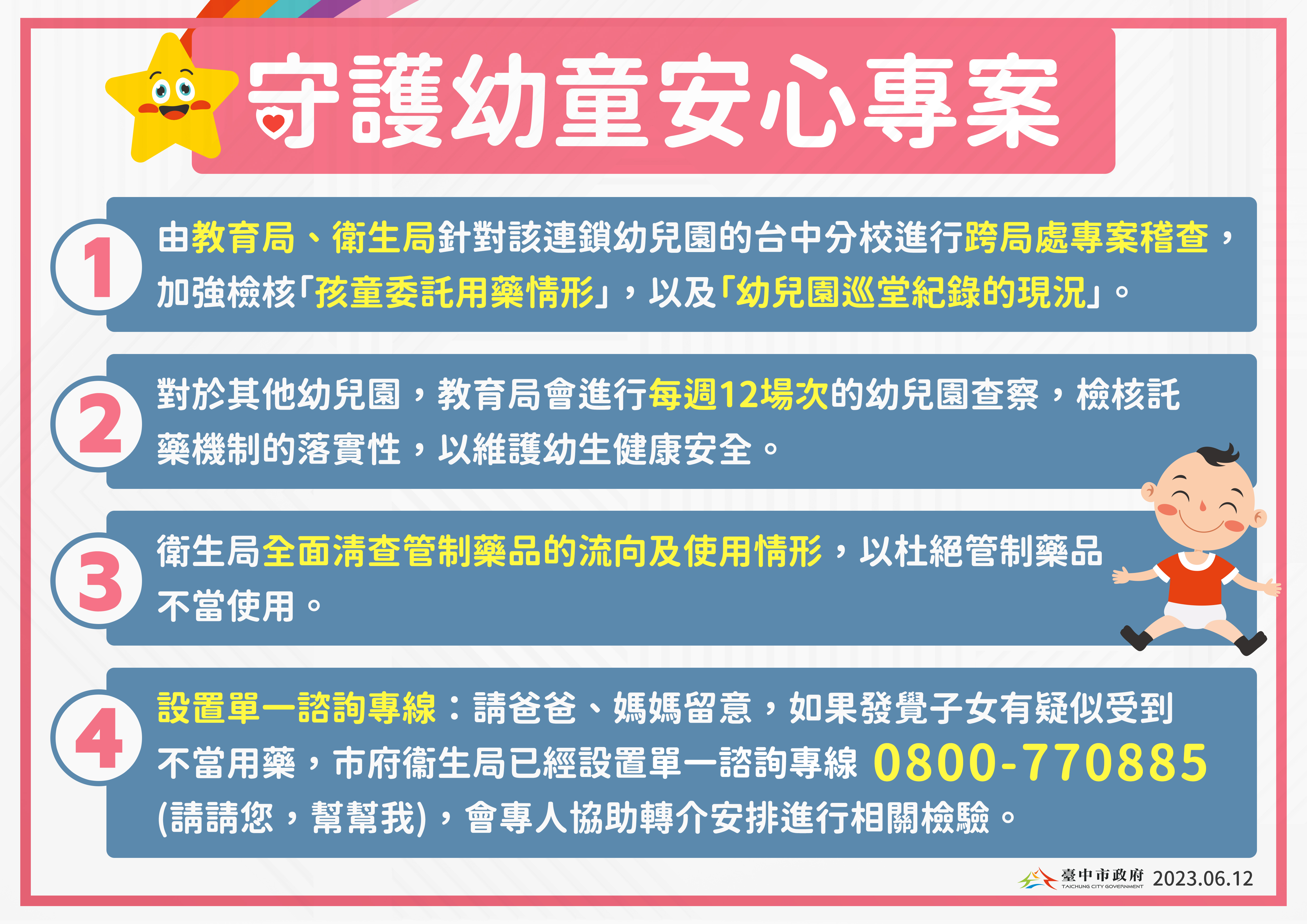 新北板橋某幼兒園發現有幼童檢驗出管制藥品事件,台中市長盧秀燕今日表示,台中上週起已啟動預防性的「守護幼童安心專案」,將執行四大措施,包含針對該家連鎖幼兒園位於台中的兩家分校預防性稽查、針對公私立幼兒園將啟動每週12次的預防性稽查、全面稽查台中市醫療院所藥局及獸醫診療等機構的管制藥品流向與數量、提供諮詢專線0800-770885(請請您,幫幫我),若家長懷疑孩子被不當用藥,此專線可提供協助。