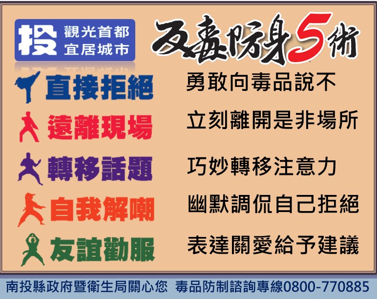 投縣衛生局長陳南松說,請熟記「反毒防身5術」:1.直接拒絕:勇敢向毒品說不;2.遠離現場:立刻離開是非場所;3.轉移話題:巧妙轉移注意力;4.自我解嘲:幽默調侃自己拒絕;5.友誼勸服:表達關愛給予建議。拒絕陌生人提供的任何物品,確保免除毒品傷害。
