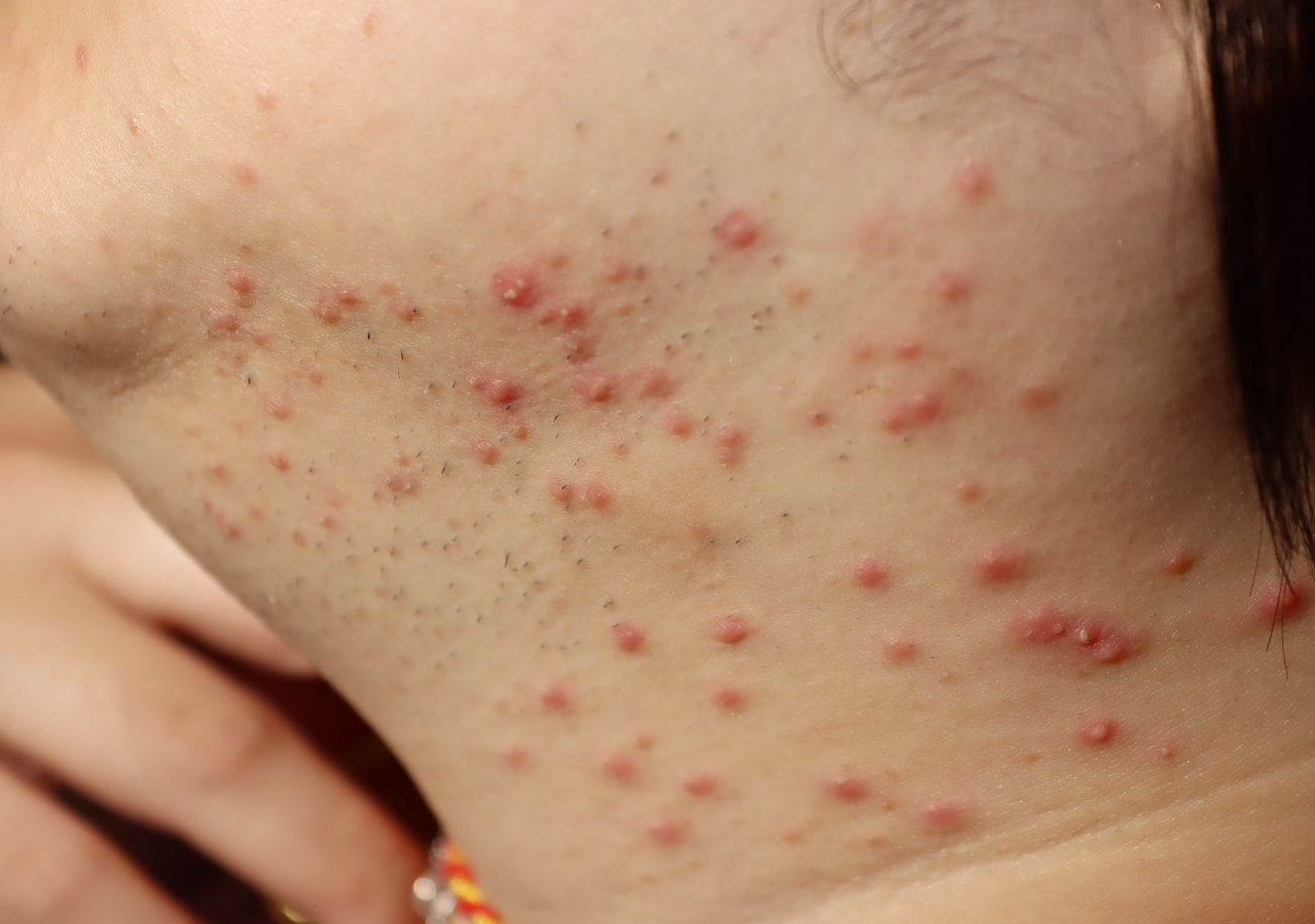 鍾佩宜指出,毛囊炎與濕疹的外觀症狀容易混淆,毛囊炎通常是毛囊受到細菌或黴菌感染引起,會出現紅腫、搔癢、膿皰甚至疼痛;濕疹則屬慢性發炎性皮膚問題,常見乾燥、脫屑、紅斑與搔癢,兩者治療方式不同,因此若皮膚狀況惡化或持續未改善,應盡早就醫診斷。