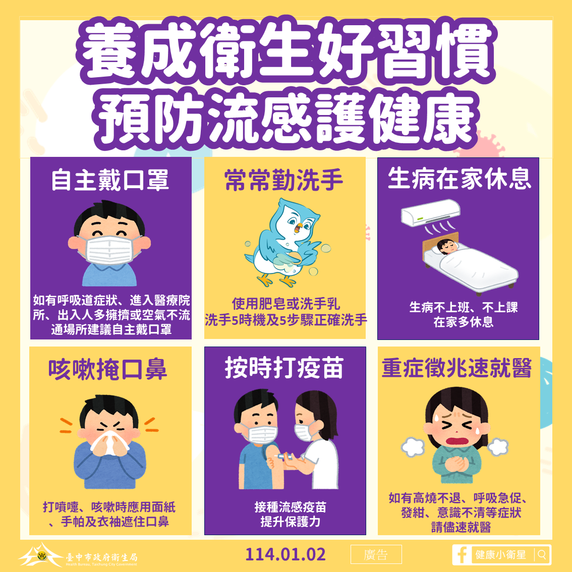 衛生局也提醒,疾管署為因應全國流感疫情已進入流行期,已於去年12月15日擴大公費流感抗病毒藥劑使用,台中市共有622家公費流感抗病毒藥劑合約院所,公費流感抗病毒藥劑儲備量充足,就醫及使用藥物可近性高。另提醒市民朋友如出現不適情形,儘速戴口罩就醫,配合醫囑治療,生病不上課、不上班,在家休息,於歲末參與各項活動或出入人潮擁擠的公共場所請自主戴口罩,落實正確勤洗手及呼吸道咳嗽禮節,維護自身及家人健康。