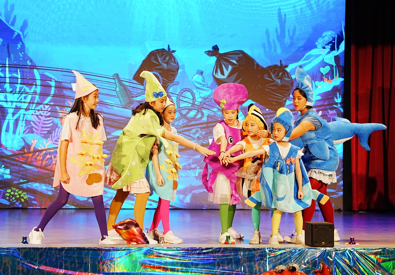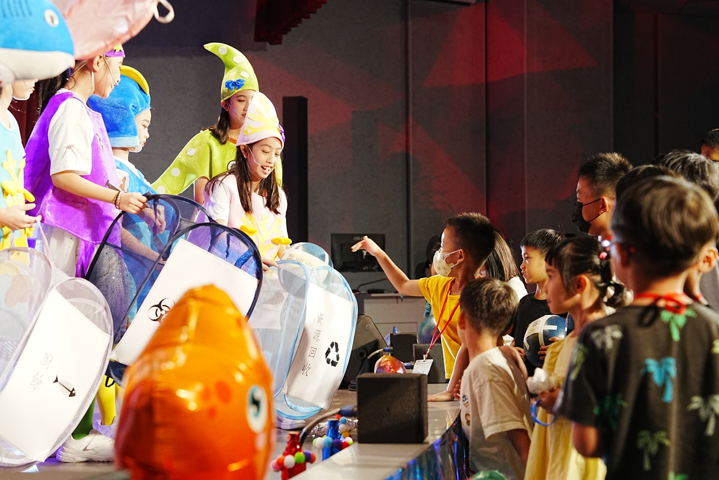 現場不只是一場表演,更像一場嘉年華會。一走進大廳,繽紛的海洋世界佈景就讓孩子們驚呼連連,套圈圈、撈金魚等夜市遊戲攤位更是大排長龍,空氣中還飄著棉花糖和雞蛋糕的香氣,讓整場活動充滿歡笑聲。孩子們玩得不亦樂乎,也在闖關中不知不覺學會環保知識。