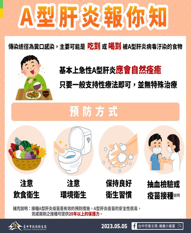 衛生局呼籲,民眾若出現疑似A型肝炎症狀,可前往醫療機構進行檢驗,衛生局已通知台中市各大醫院,如醫師診療時發現疑似病例,應詳細詢問食用莓果等飲食史,並依規定通報,以利衛生機關及時疫調與介入處理,降低疾病傳播可能性。