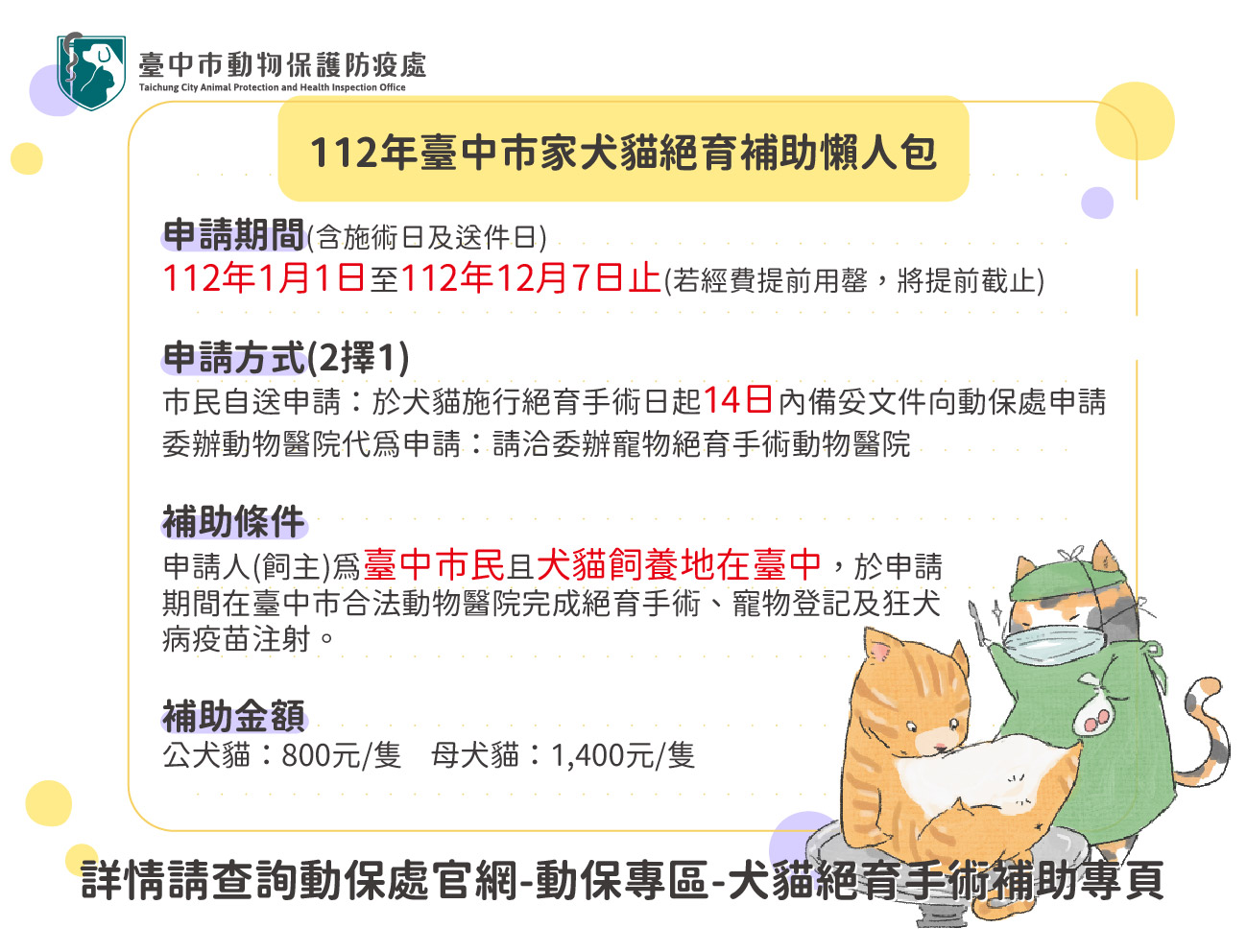 犬貓絕育好處多,不但可降低罹患乳腺腫瘤、睪丸癌或前列腺癌的風險、避免子宮蓄膿等疾病,也能增進寵物情緒穩定,一定程度內改善動物標示地盤或競爭領域的行為。台中市動物保護防疫處為鼓勵民眾替飼養犬貓完成絕育手術,提供家犬貓絕育手術補助優惠專案,符合補助條件即可享有公犬貓補助800元、母犬貓補助1400元。