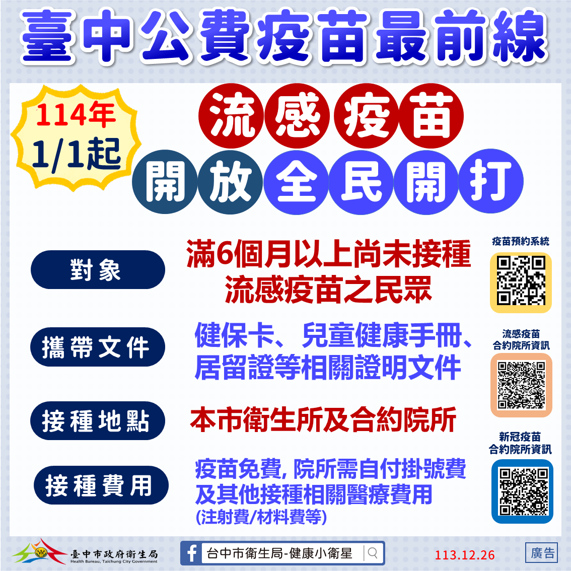 為提升疫苗接種人口涵蓋率,發揮疫苗最大效益,自明年1月1日起,公費流感疫苗擴大提供全國6個月以上尚未接種的民眾接種,至疫苗用罄為止。台中市政府衛生局提醒,台中市公費流感疫苗僅剩約13萬餘劑,疫苗數量有限,流感疫苗開放全民開打前,請65歲以上長者、高風險慢性病人、學生及學齡前幼兒等重點族群儘快接種疫苗,儘早獲得保護力,保障自身的健康。