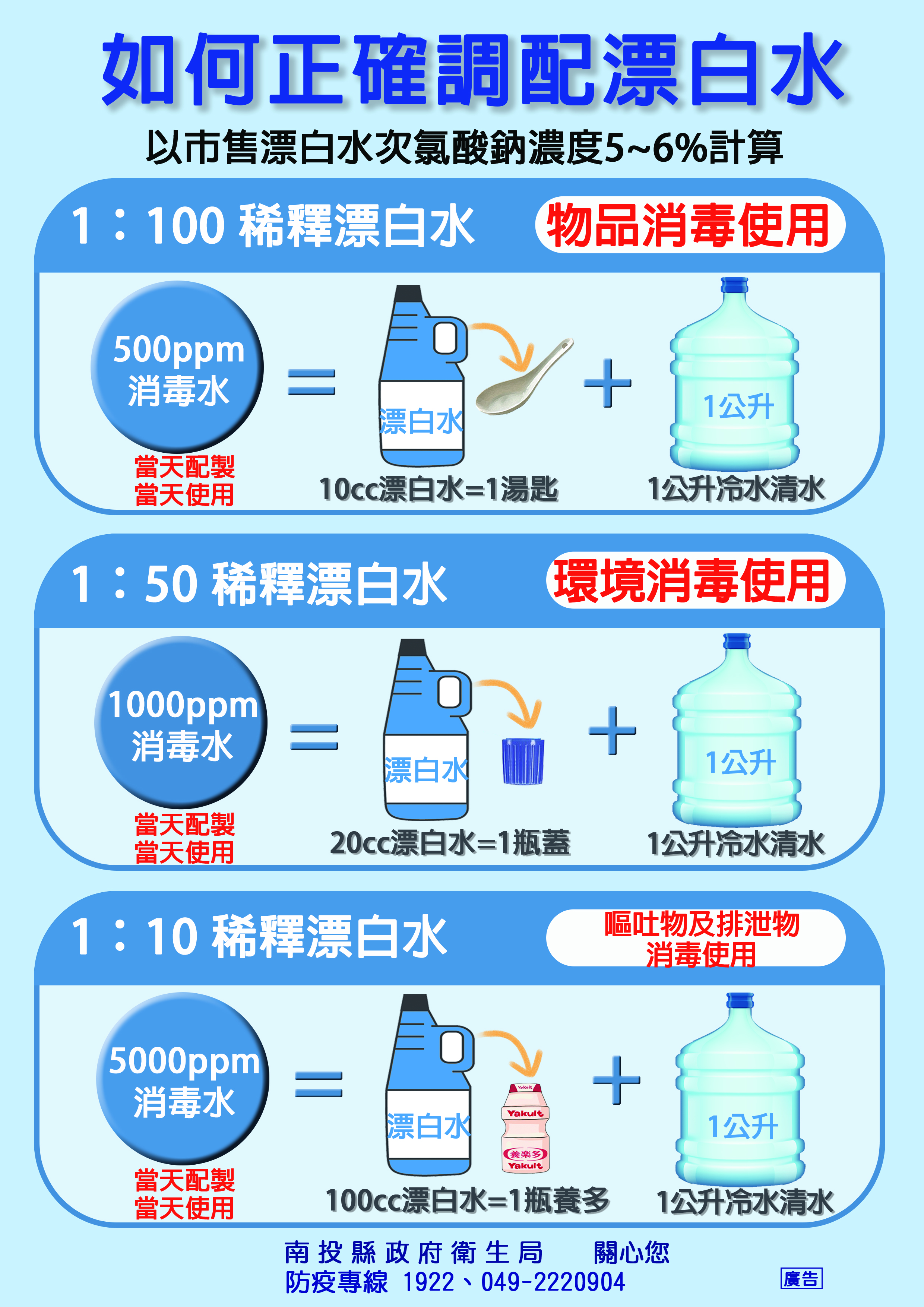 陳南松提醒民眾,平常可使用稀釋過的漂白水,以20c.c.漂白水(約1瓶蓋)+1公升清水稀釋拌勻後,針對環境及常用物品消毒。出入公共場所、用餐前務必濕洗手,才能有效預防感染腸病毒。