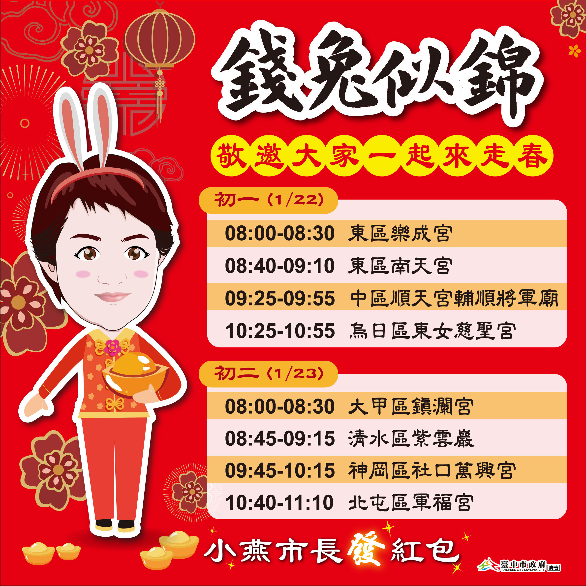 農曆兔年將至,為分享年節喜氣,市長盧秀燕將於1月22日(初一)、1月23日(初二)連跑8間宮廟發送「錢兔似錦」春節小紅包,今年市長小紅包採兔耳朵探出頭的立體設計,象徵新春到、新年到,內含10元硬幣祝大家恭喜發財、過好年。