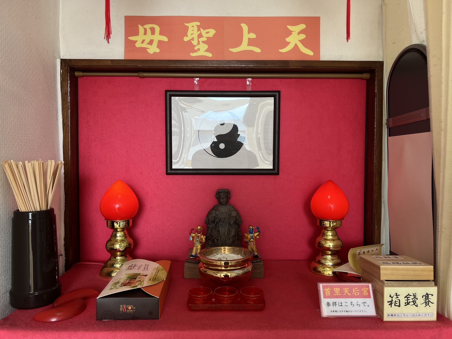 2017年落成的首里天后宮,其媽祖神靈與神像來自何方?有感媽祖婆的慈悲護佑,當原先生不辭辛勞地飛到臺灣,透過有共同宗教理念的臺灣友人協助,迎請鎮殿聖母像並舉行入神儀式,此後便坐鎮那霸、守護蒼生。除了媽祖神像之外,在有限的空間裡,供奉著千里眼將軍及順風耳將軍,柑仔燈點亮你我心燈、求籤筒供人排憂解惑、大紅色筊杯明辨是非,有趣的是,日本神社寺院中常見的賽錢箱也擺在一旁,毫無違和感。