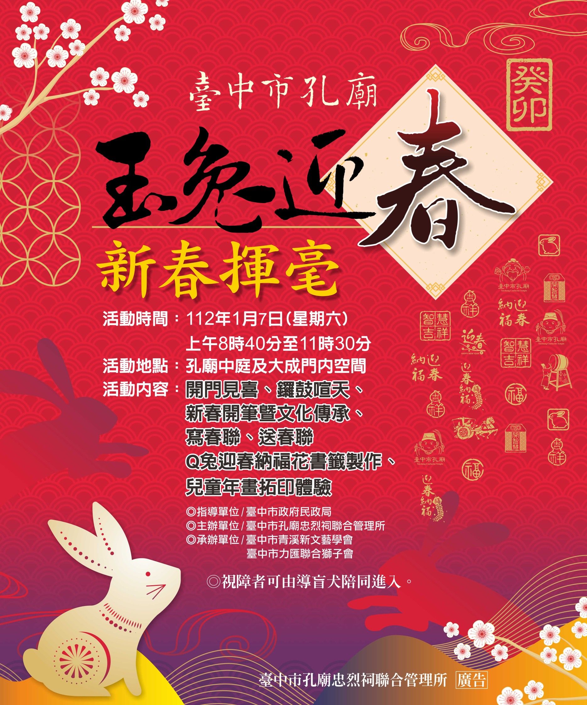 中市民政局長吳世瑋說明,台中孔廟迎春揮毫活動已連續舉辦多年,除弘揚及推展書法傳統優良文化,也藉此機會讓到訪民眾感受台中孔廟建築之美及孔子文化精神,增添孔廟文化社教的功能,歡迎民眾至孔廟大成殿向至聖先師祈求智慧大開,迎接春來福兔大好年。