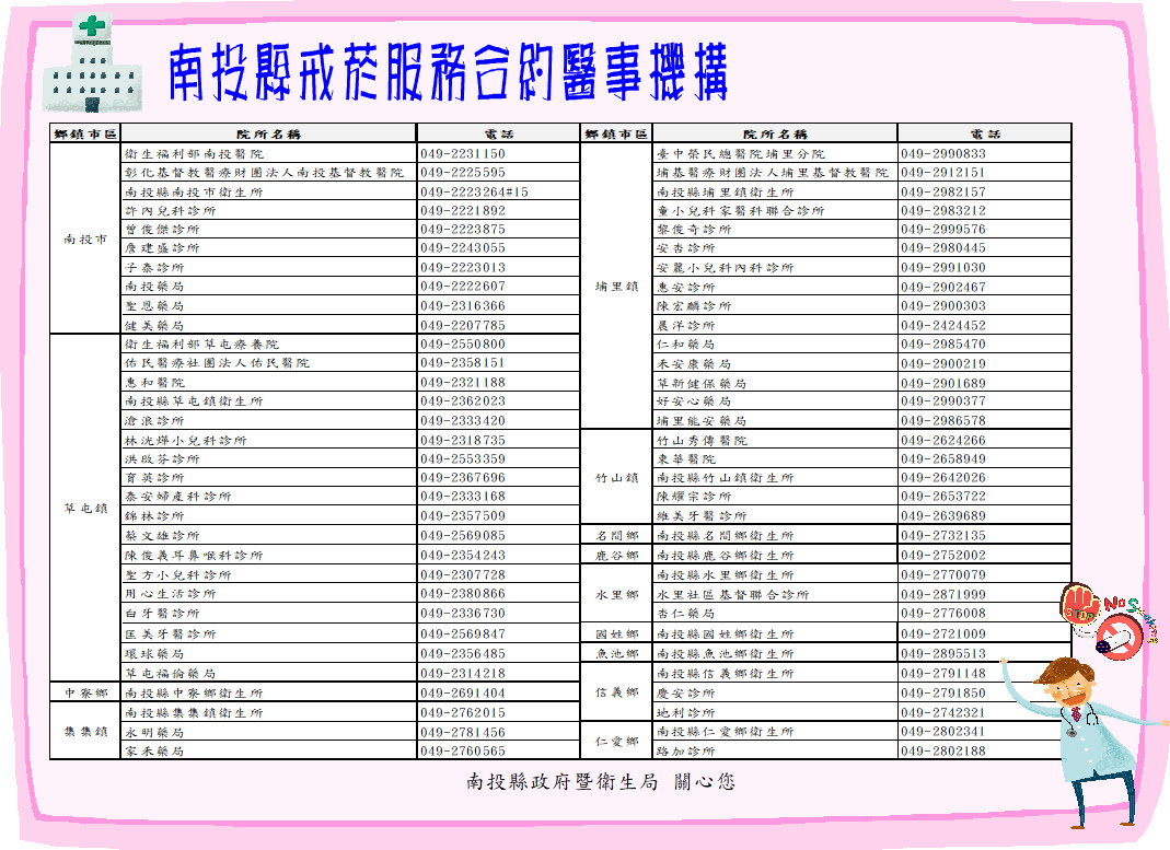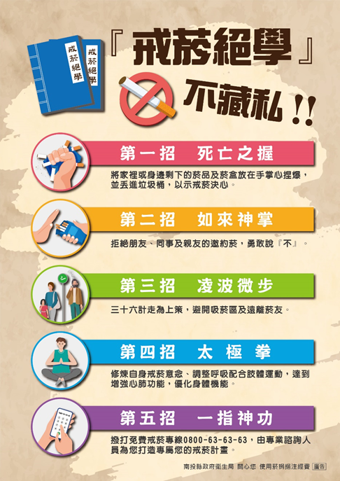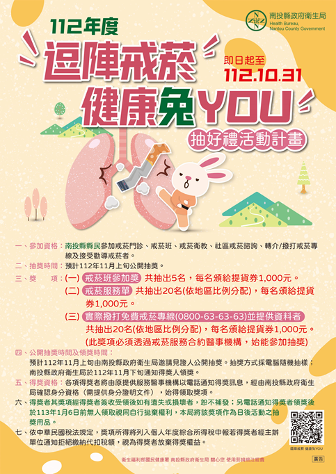 菸害防制法新法日前修正上路,加強反菸拒菸意識。南投縣衛生局長陳南松表示,南投縣111年度成人吸菸率12.6%,雖有逐年降低,但仍高於全國10.1%。為維護民眾健康生活與環境,遠離吸菸造成的危害,因此舉辦「逗陣戒菸 健康兔YOU」抽獎活動,吸菸者參加南投縣內64家戒菸服務合約醫事機構之多元戒菸服務,並填寫戒菸服務單,即可參加戒菸抽好禮。