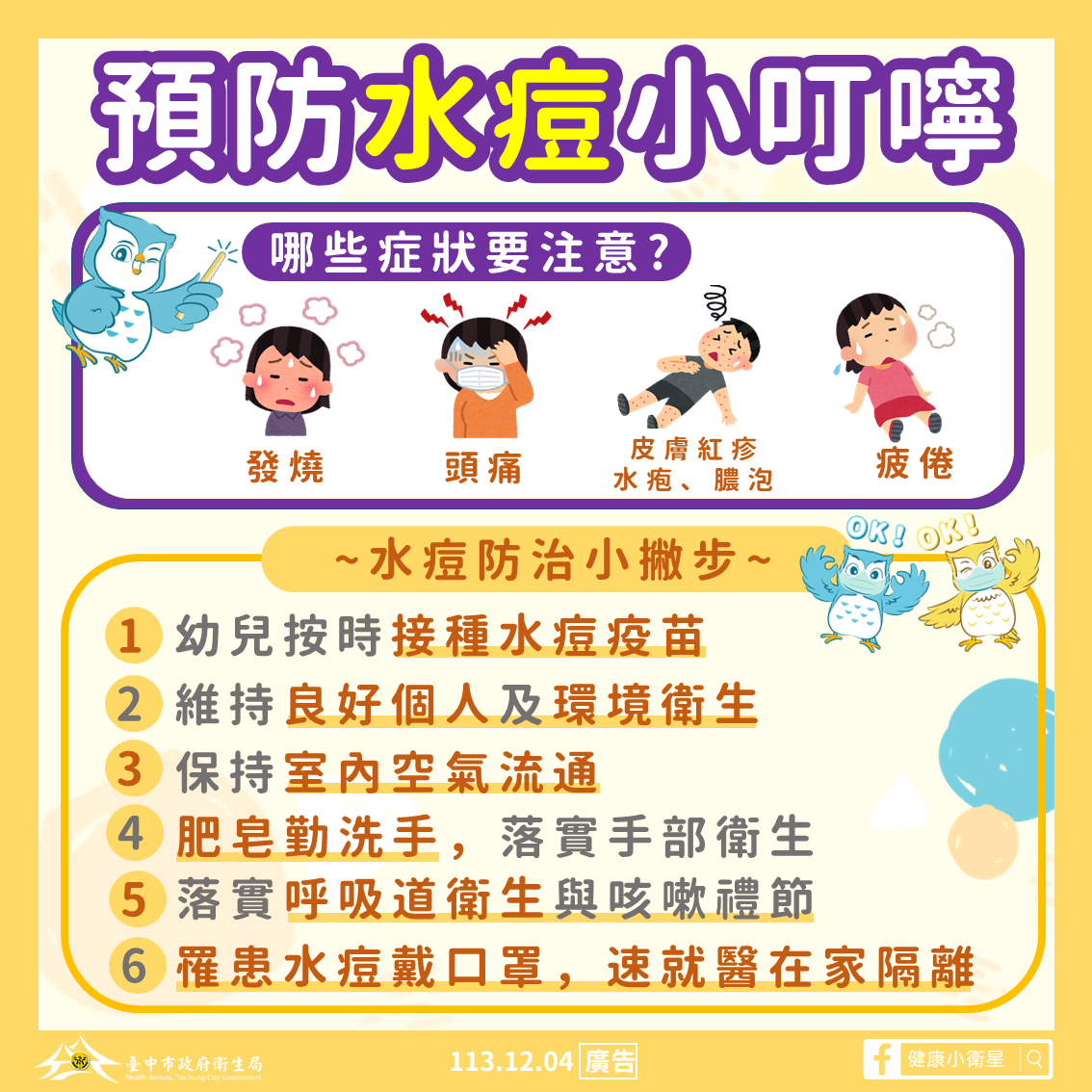 衛生局長曾梓展說明,水痘大多為輕症,但傳染力極強,潛伏期約2至3週,好發於冬季及早春,可經由皮膚接觸水疱液和黏膜分泌物、空氣或飛沫傳播,提醒孕婦、小於1歲嬰兒、成人及免疫缺陷者,皆為水痘併發症高危險群,感染水痘後可能出現繼發性細菌感染、肺炎、腦炎等併發症,提醒市民朋友如出現發燒、皮膚出現紅疹、丘疹、水疱、膿疱等症狀,請穿長袖衣褲、戴口罩儘速就醫,經醫診斷為水痘後,請落實生病不上班、不上課在家隔離至水痘完全變乾結痂。