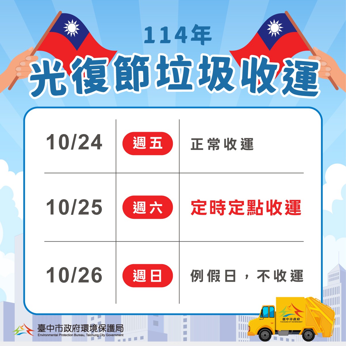 因應10月25日台灣光復節及金門古寧頭大捷紀念日,台中市政府環境保護局公告,光復節連假期間垃圾收運服務將有所調整,10月24日(五)維持正常沿街收運,10月25日(六)則暫停沿街收運,改採「定時定點」方式提供服務,於全市設置638處收運定點,每處停留約5至30分鐘,方便市民投遞垃圾。環保局提醒,民眾可事先掌握收運時段,並配合時間前往指定地點倒垃圾,以維持環境整潔。