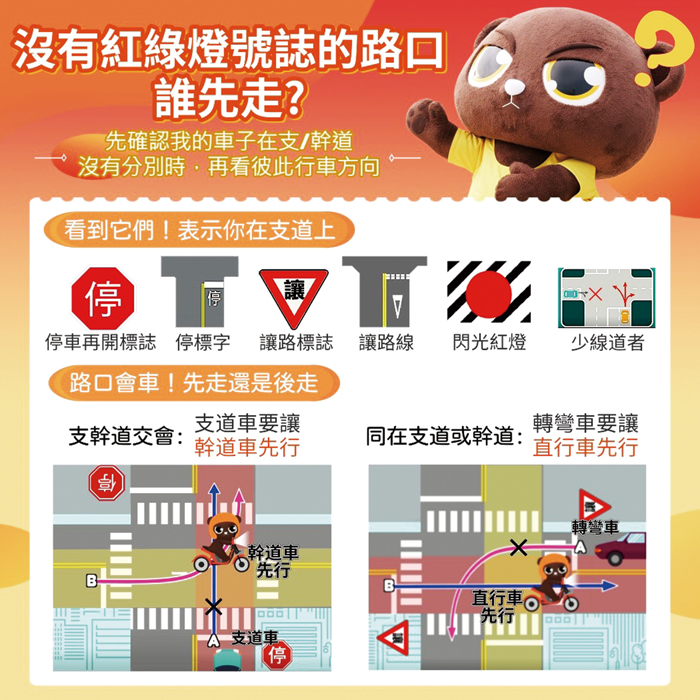 只要道路上有設置倒三角形紅色之「讓路標誌」、八角形紅色之「停車再開標誌」,或劃設「讓路線」或「停」標字,或設置閃光紅燈號誌時,均表示該道路為支線道,支線道的車輛行駛至路口,負有暫停讓行駛於幹線道車先行之義務。而道路上設置閃光黃燈號誌,表示該道路為幹線道,雖然行駛在幹線道的車輛擁有優先行駛的權利,但該權利並非能夠無限上綱,仍應該減速接近,注意安全,小心通過。