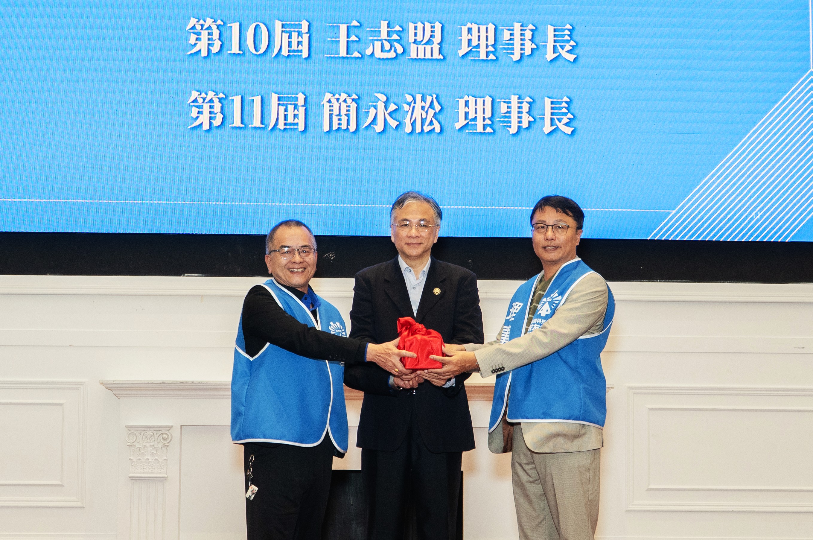 朝陽科大校友總會新舊任理事長交接,在校長鄭道明(中)監交下,王志盟理事長(左)將印信交給新任理事長簡永淞(右),象徵傳承與創新。
