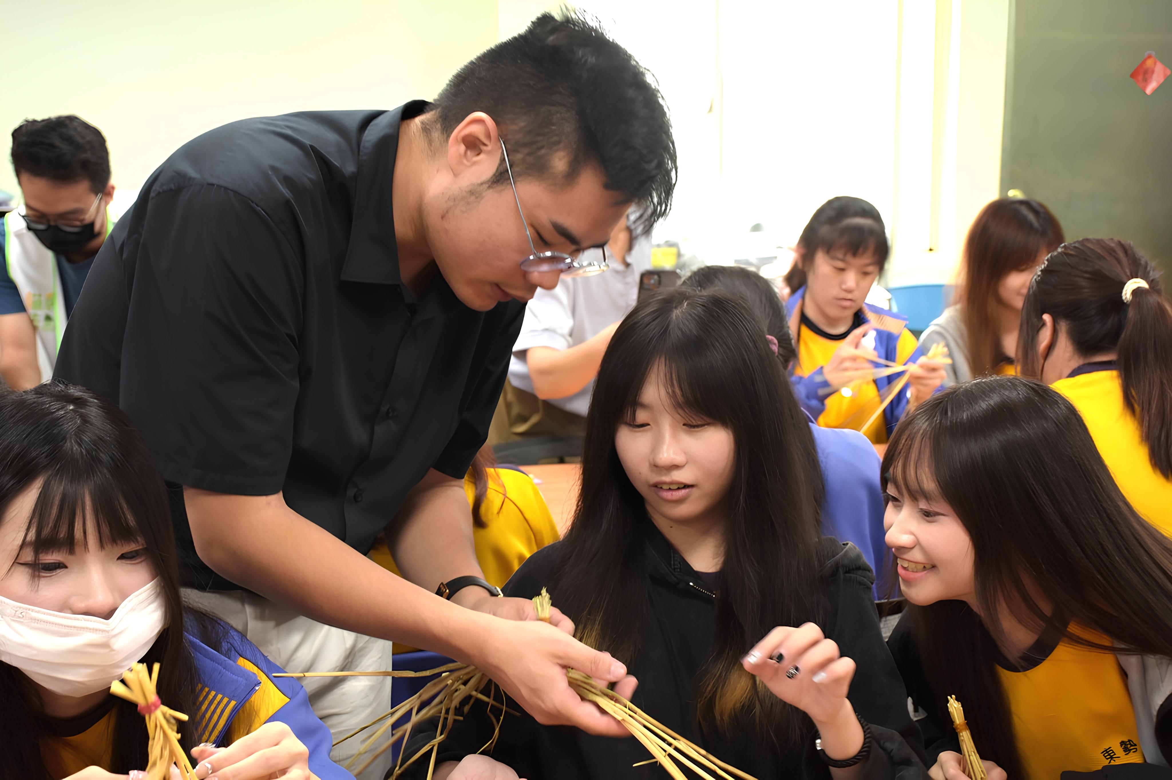 工業設計系推動「貓裏法默跨域永續躍升計畫」,帶領東勢高工學生,將鯉魚社區的農廢稻草,DIY祈福用的注連繩,讓永續教育向下紮根。