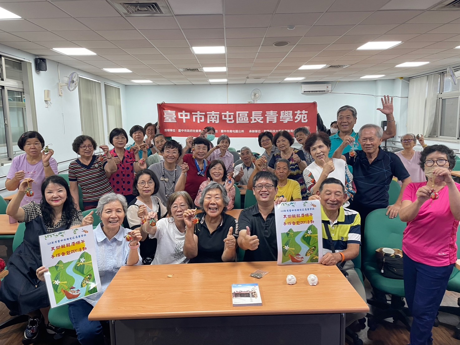 慶祝端午佳節,臺中市南屯區長青學苑特別舉辦「手作香包慶端午」活動,帶領銀髮學員一起製作應景艾草香包,並結合在地課程「旅讀南屯建築之美」,由李建峰老師指導使用水泥製作環保安全的擴香石,學員參與十分踴躍,場面熱烈。