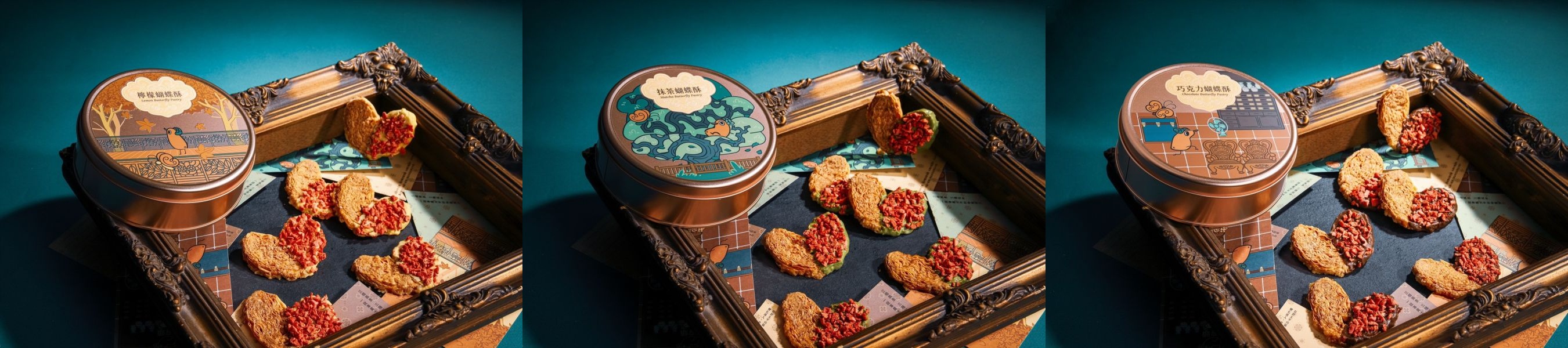 作品以「太平三景」為核心,建立「一景一味」的設計系統,將景觀特色轉譯為不同口味與色彩,包含以楓香林榭步道為靈感的檸檬蝴蝶酥、呼應百年大樟樹意象的抹茶蝴蝶酥,以及象徵古農莊文物館歷史氛圍的巧克力蝴蝶酥,每一款口味皆搭配專屬插畫圓鐵盒與景點插畫明信片,形成完整一致的敘事架構。
